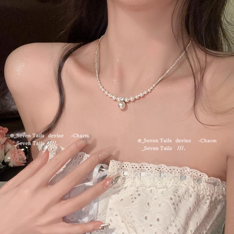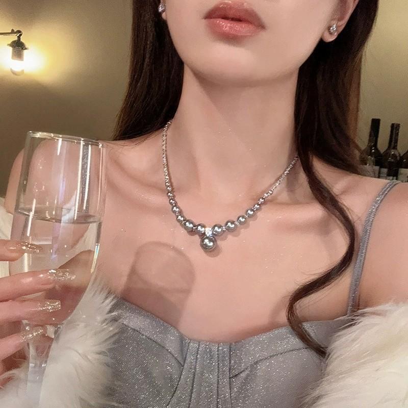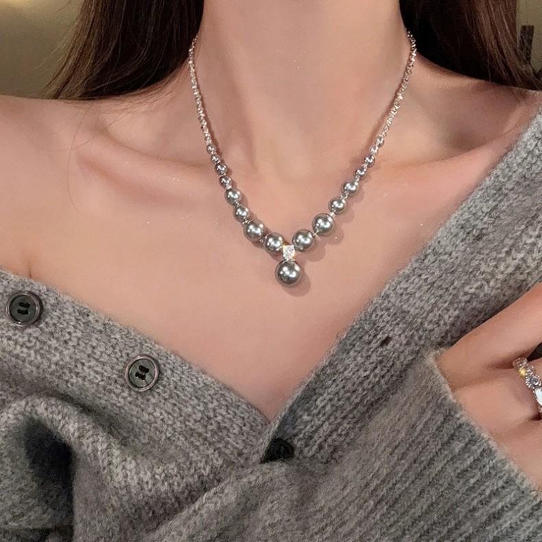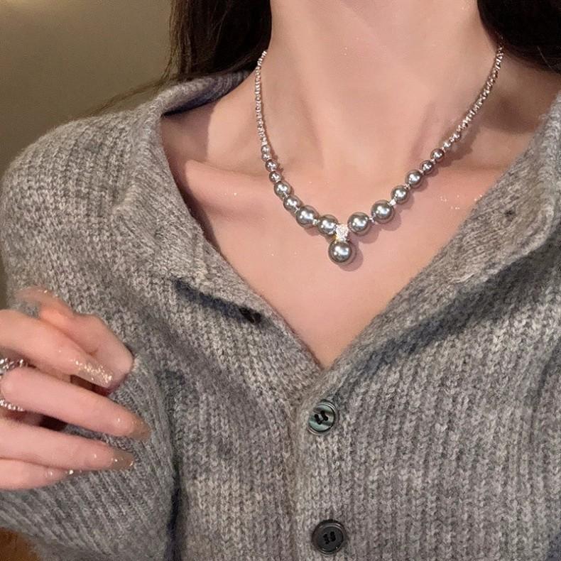 Colar de pérolas cinza com design de luxo leve, versátil, feminino, corrente de clavícula, novo estilo quente, 2024