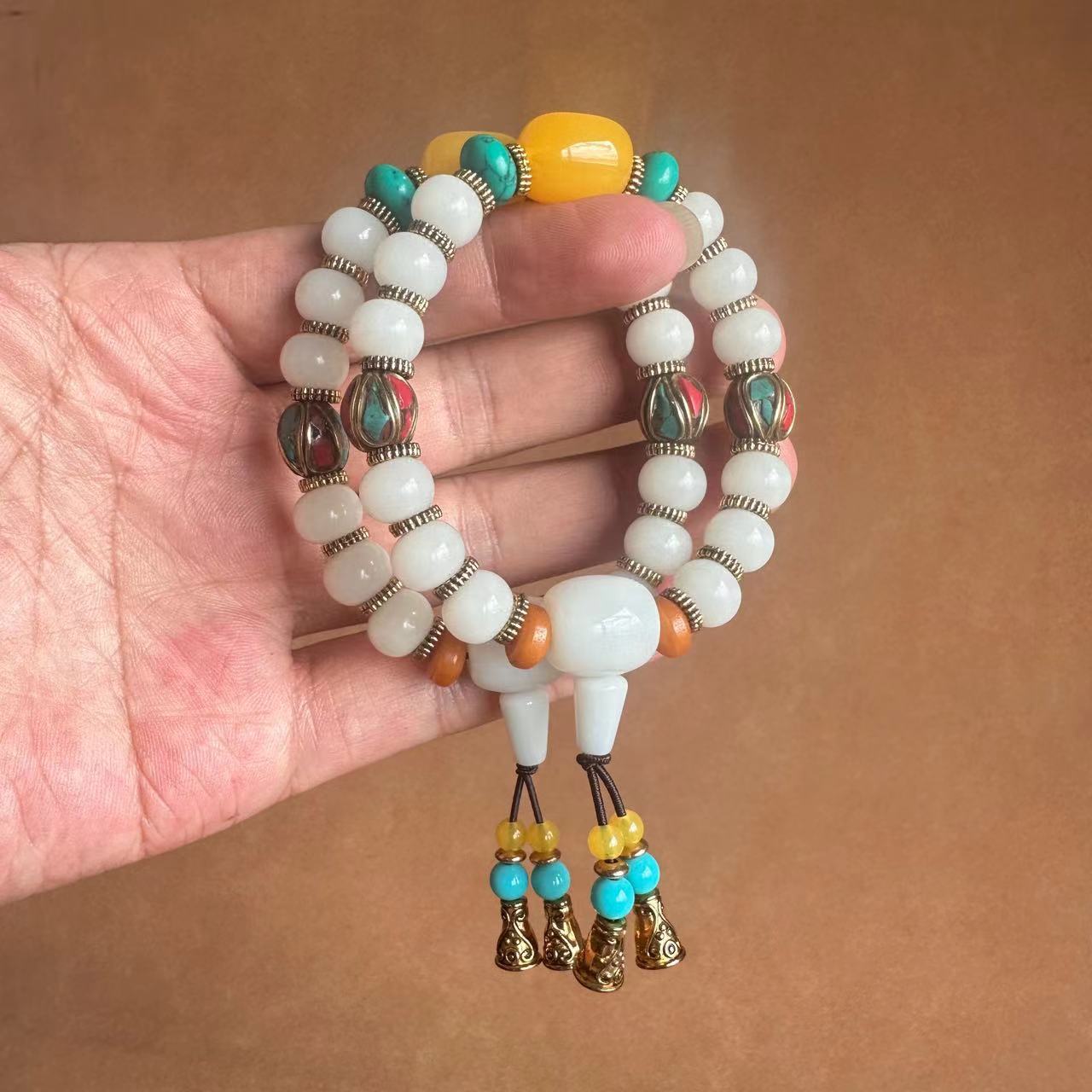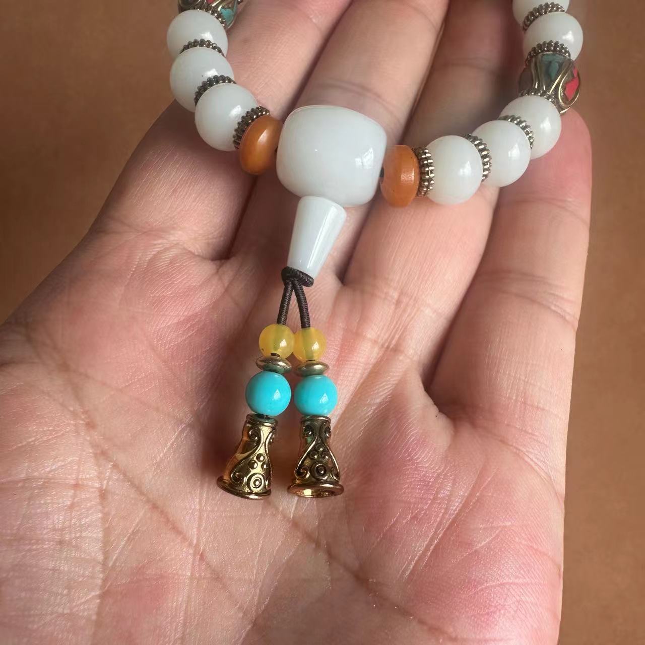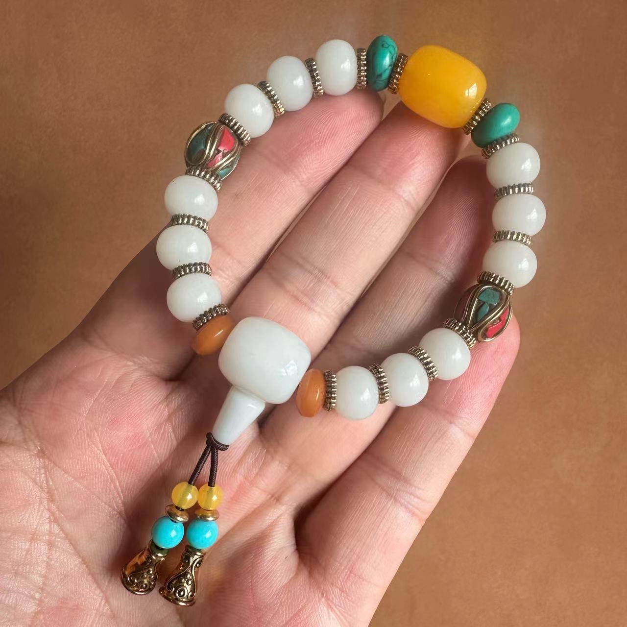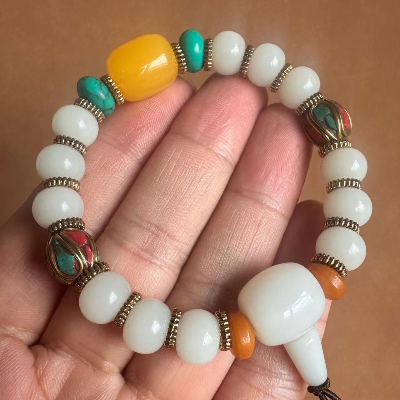 White jade bodhi bracelet [cinnabar pixiu style], White jade bodhi bracelet [plain bead style], White jade bod...