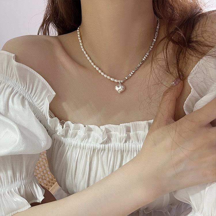 Pérola brilhante costura metal prata coração colar personalidade feminina simples all-match temperamento colar clavícula cadeia feminina