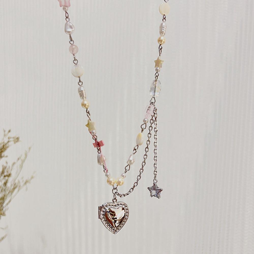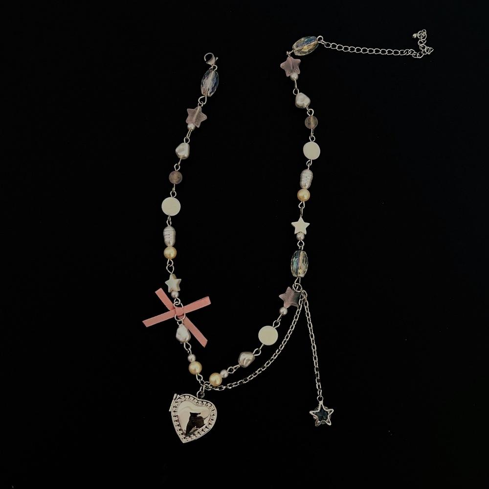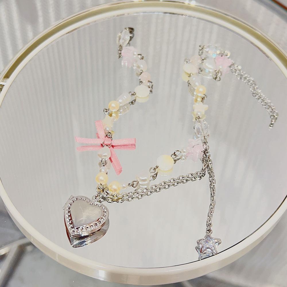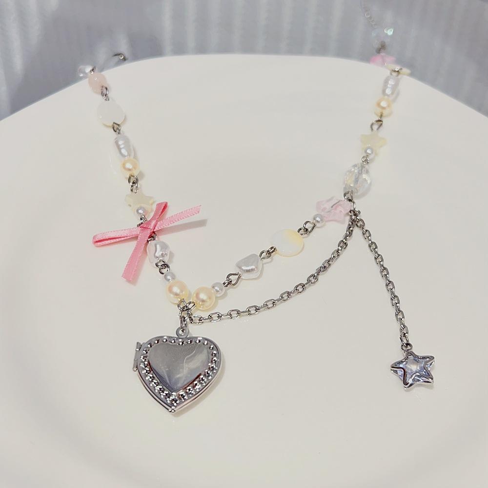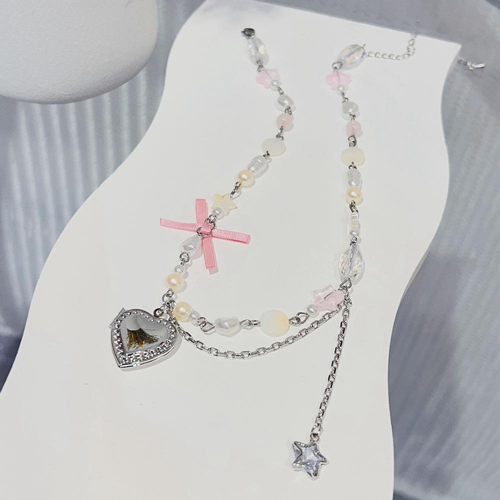 Pingente de corrente com laço rosa e pérolas mistas da moda, borla, corrente de clavícula de camada dupla, acessórios de concha