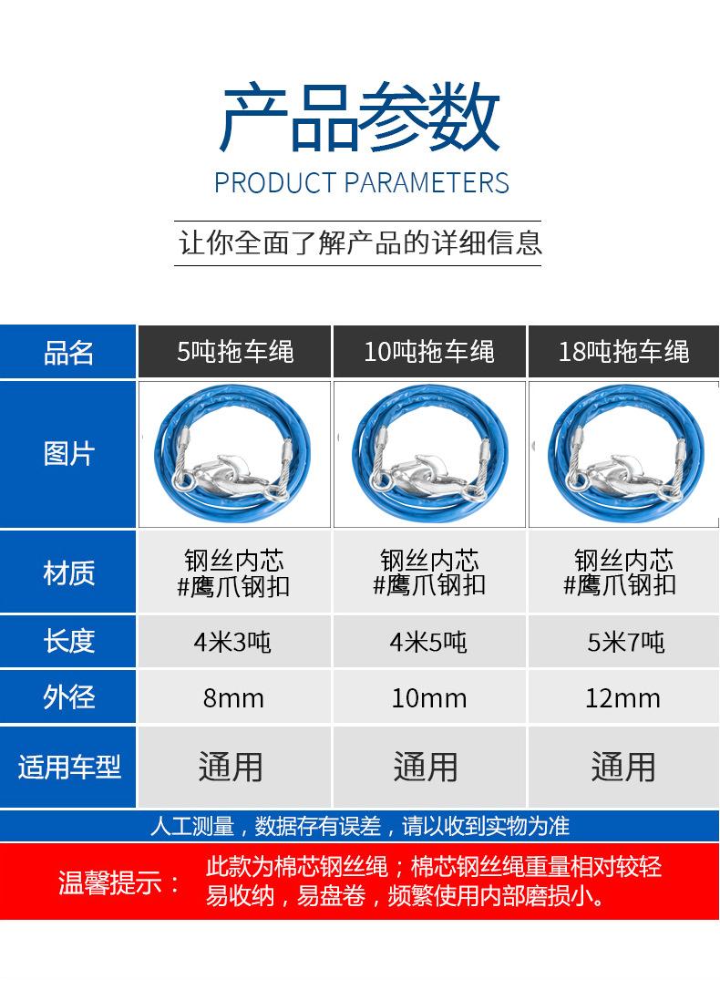 【Função do Produto】:1. O produto é bem feito e pode prevenir e reduzir eficazmente a vibração da corda durante o reboque, garantindo a estabilidade. 2. O gancho de ferro metálico resistente é seguro e confiável, prevenindo eficazmente que o gancho se solte durante o uso. 3. Adequado para rebocar veículos médios e pequenos. 【Instruções de Uso】:Prenda os ganchos em ambos os lados aos olhais do chassi do veículo de resgate e do veículo avariado, respectivamente. Quando a distância entre os dois veículos aumentar gradualmente e o cabo de aço estiver totalmente tensionado, ele pode funcionar normalmente.