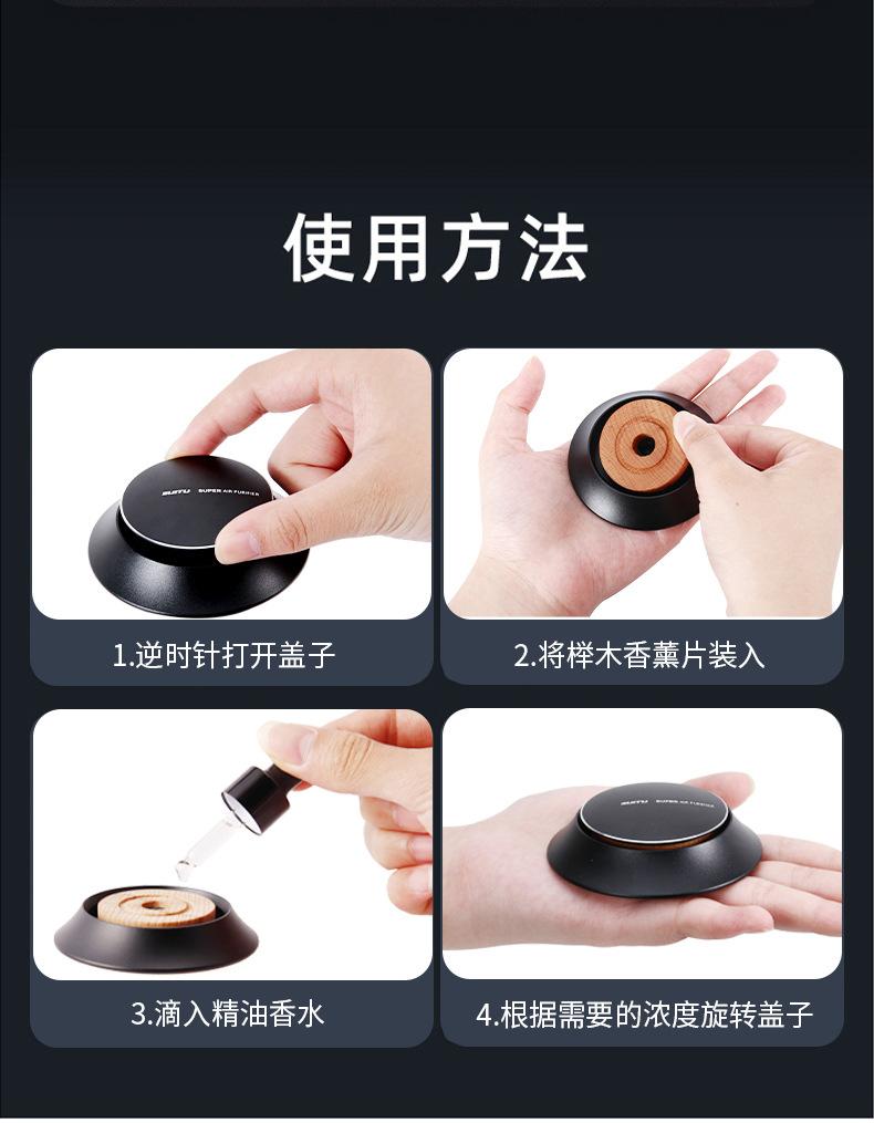 1Desenrosque a tampa no sentido anti-horário2Retire os comprimidos de aromaterapia de madeira de faia3Coloque os comprimidos de aromaterapia de madeira de faia na bandeja de aromaterapia4Adicione perfume de óleo essencial5Enrosque a tampa e feche a tampa externa de acordo com a concentração de fragrância desejada6Coloque-o no painel de instrumentos ou em outros locais onde seja necessário