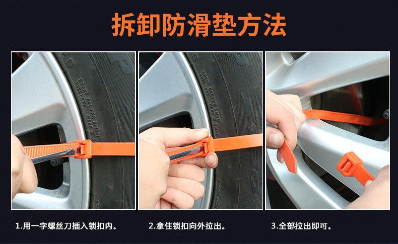 Modo de usar: aponte a cabeça de travamento da braçadeira para a parte externa do pneu, coloque os dentes antiderrapantes da braçadeira perto da superfície de atrito entre o pneu e o solo, passe a ponta da braçadeira pelo furo de dentro para fora e puxe-a para travá-la firmemente.