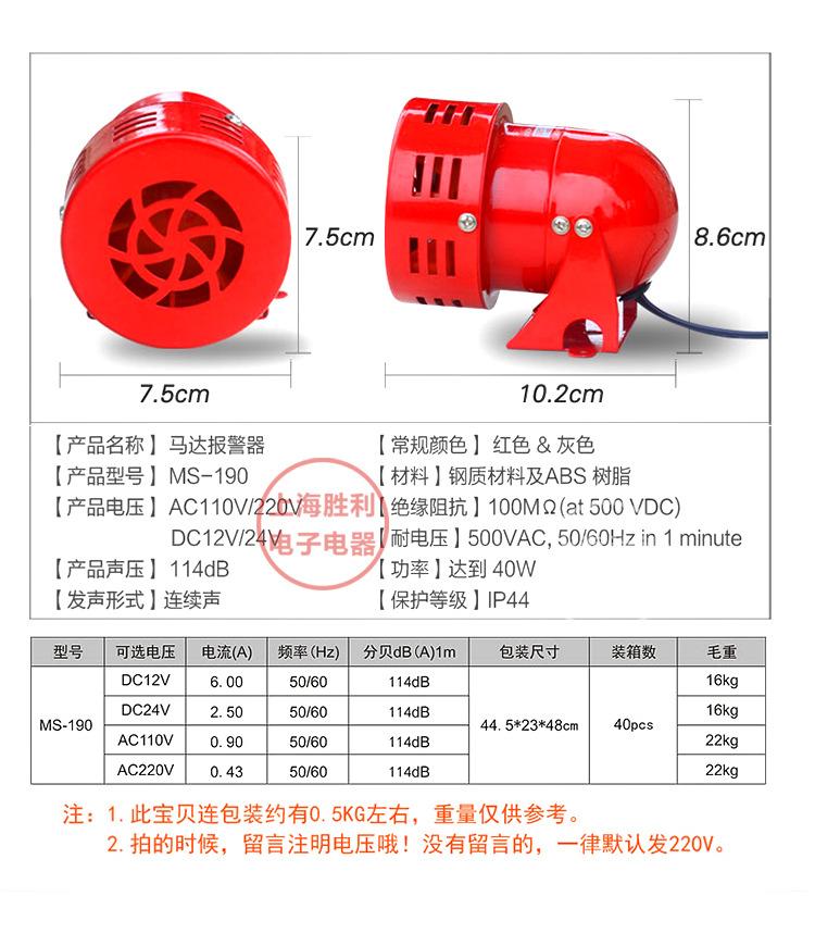 MS-190 mini alarme motor/campainha de alarme (caracol de ar) concha de ferro 220V