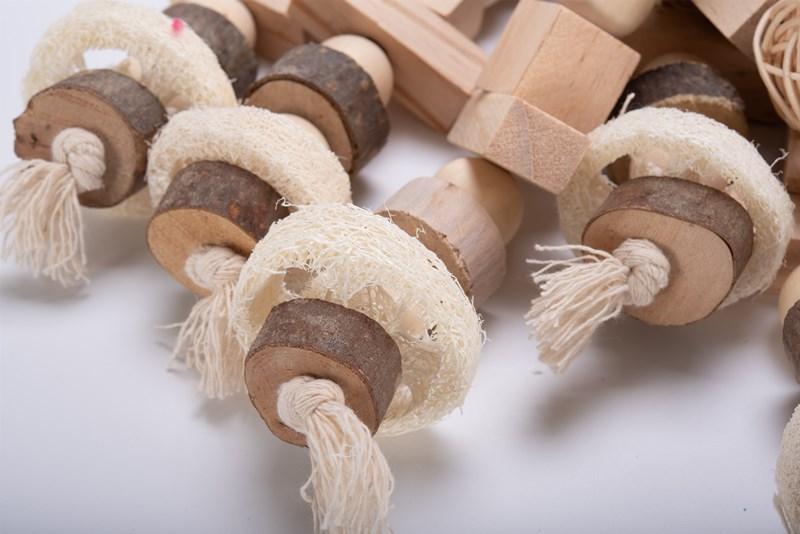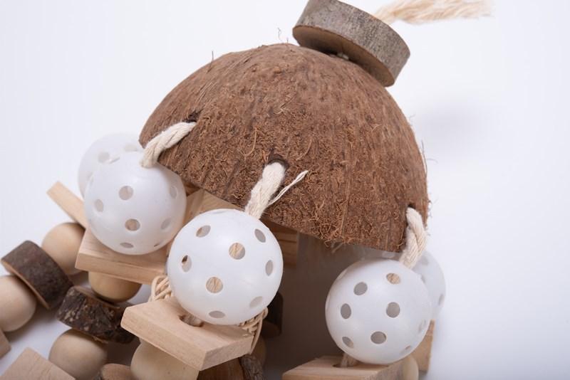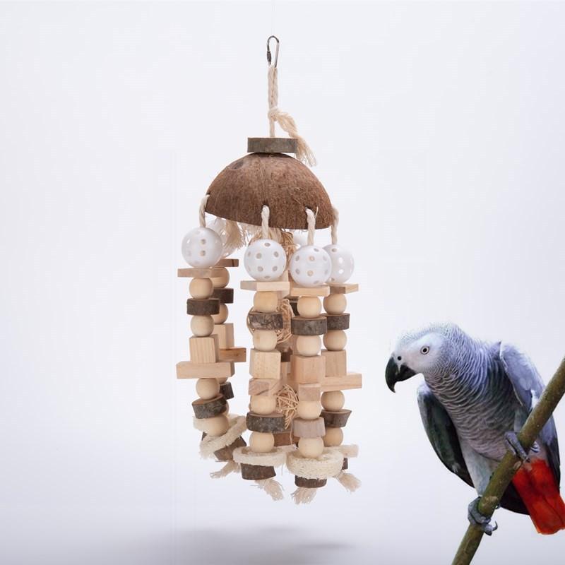 Brinquedo de mordida de papagaio médio e grande Brinquedo de papagaio transfronteiriço da Amazônia mordida de casca de coco corda bucha de madeira