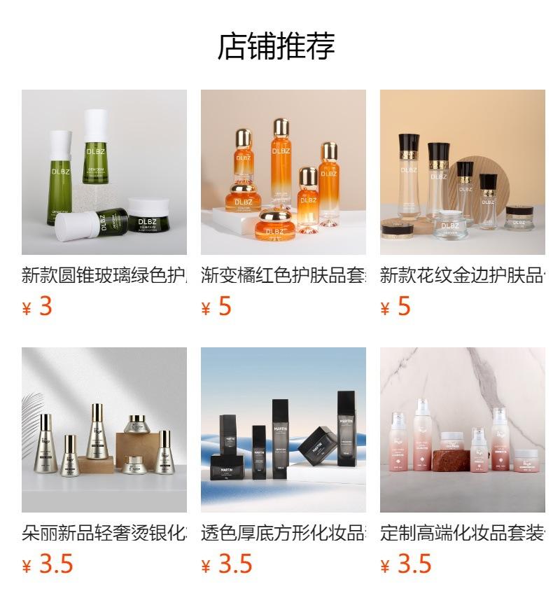 30g cream bottle*glass, 50g cream bottle*glass, 50ml essence bottle*glass, 100ml lotion bottle*glass, 120ml toner bottle*glass