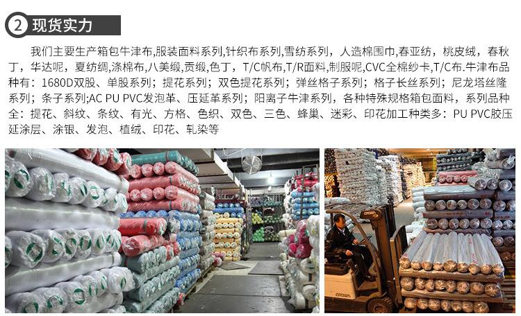 Produzimos principalmente tecidos Oxford para bolsas, séries de tecidos para roupas, séries de tecidos de malha, séries de chiffon, cachecol de algodão artificial, pongee de poliéster, pele de pêssego, sarja de primavera e outono, gabardine, seda de verão, tecido de poliéster-algodão, cetim, cetim, lona T/C, tecido T/R, tecido uniforme, sarja de algodão CVC, tecido T/C. As variedades de tecidos Oxford incluem: séries 1680D de camada dupla e camada única; série jacquard; série jacquard de duas cores; série de treliça elástica; série de filamentos de treliça; série taslon de náilon; série de listras; couro de espuma AC PU PVC, série de couro calandrado; série Oxford catiônica; várias especificações especiais de séries de tecidos para bolsas