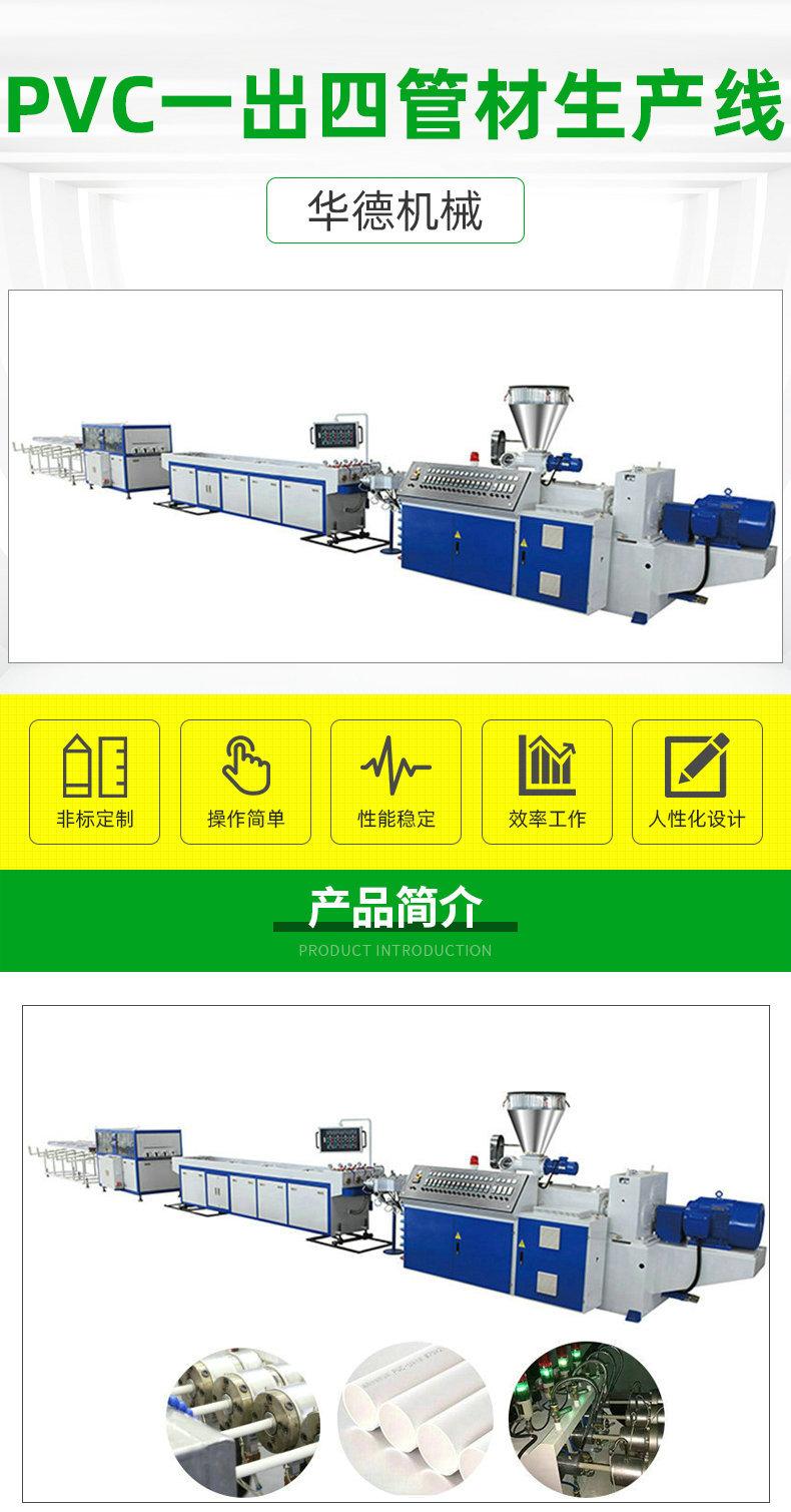 Um molde de quatro tubos de PVC, a produção de tubos de abastecimento de água pode reduzir os custos de investimento em equipamentos, custos de investimento em plantas e custos de investimento em produção, aumentando muito a produção. Com o cone duplo 65 host, ele pode facilmente atingir 55-6,5 toneladas/dia, 16≥8-10 metros/minuto. A linha de produção de quatro saídas inclui um cone duplo 65 host, um de quatro moldes, um de quatro resfriamentos e moldagem de quatro máquinas de tração, uma de quatro máquinas de corte e um de quatro racks de giro.