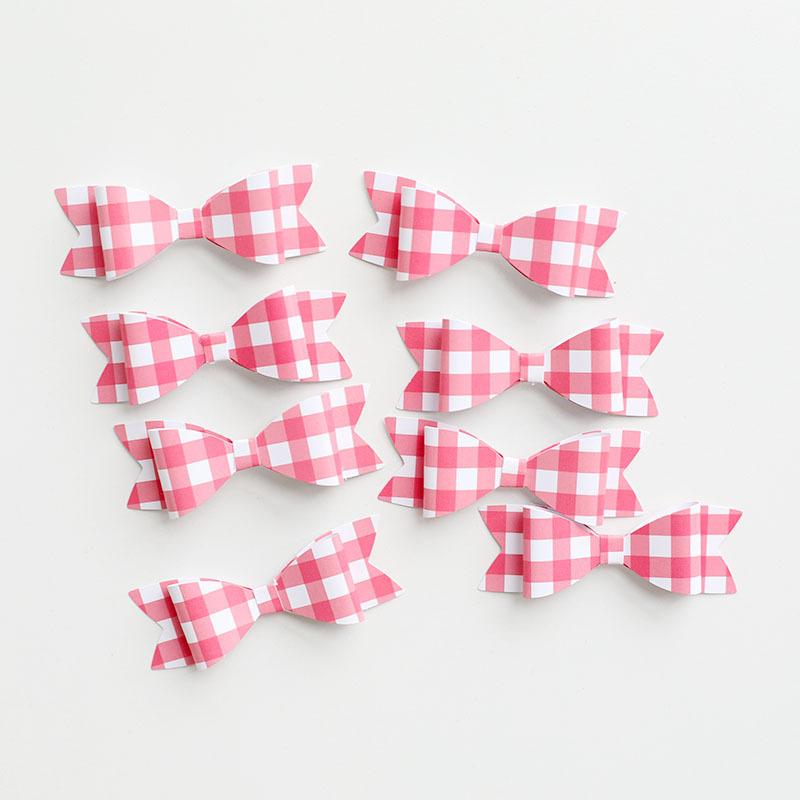 A box of pink bows, A box of red bow, A box of mixed color bows