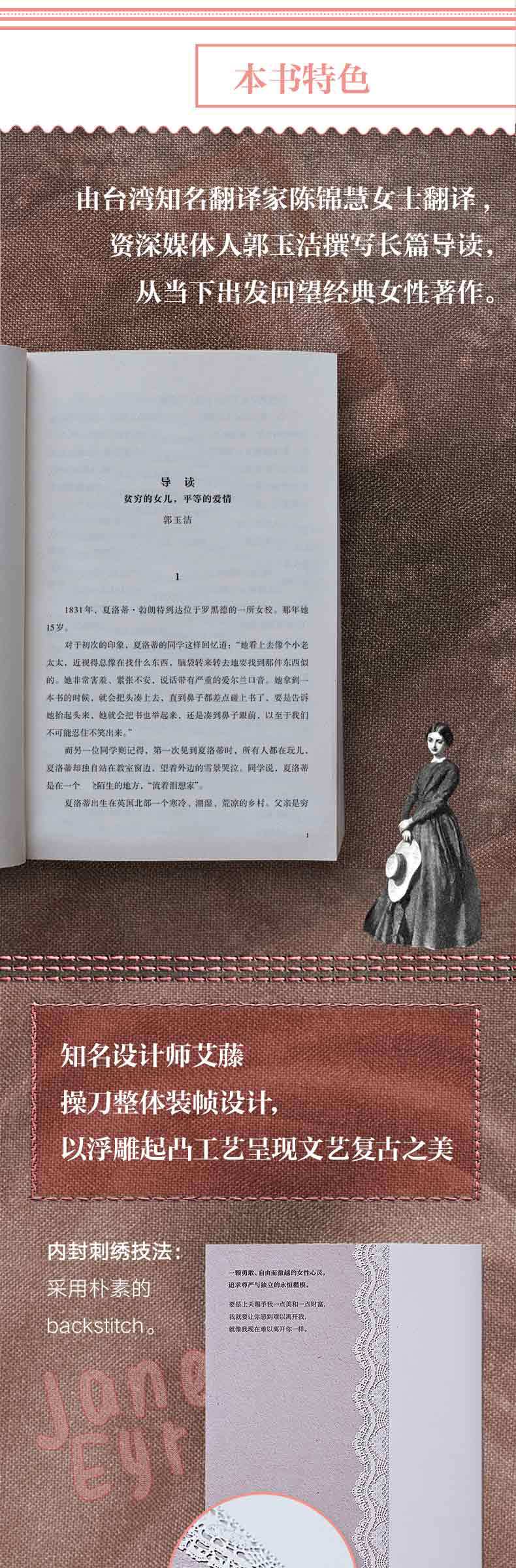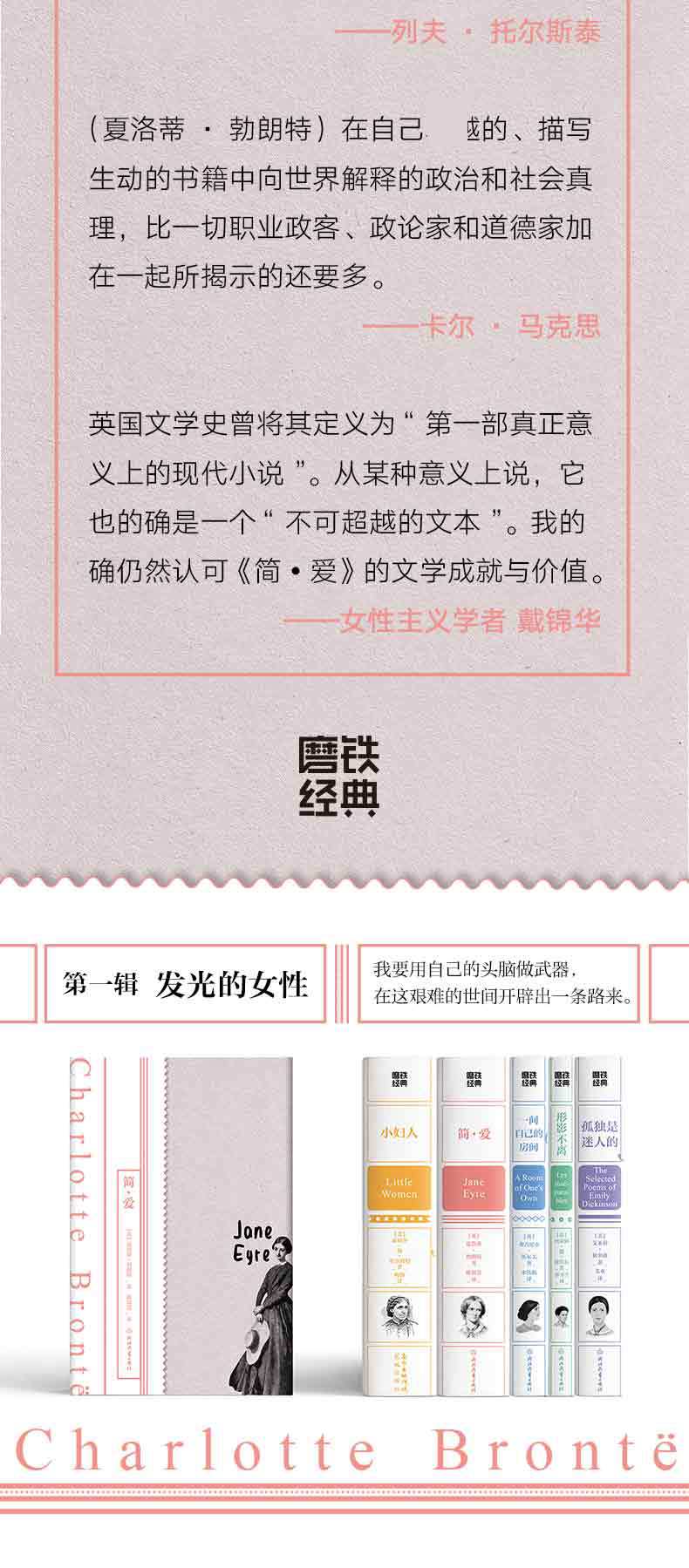 ◆Um clássico literário que circulou por quase dois séculos, uma bíblia emocional escrita para mulheres em todo o mundo. Tolstói comentou uma vez: A ideia expressa em "Jane Eyre", ou seja, as mulheres não estão contentes com o status atribuído a elas pela sociedade e exigem independência e igualdade no trabalho e no casamento, era extraordinária na época. ◆A veterana da mídia Guo Yujie escreveu uma longa introdução, olhando para as obras femininas clássicas da perspectiva da situação atual das mulheres. ◆Um dos livros didáticos do ensino médio mais comumente usados em países de língua inglesa. "Jane Eyre" ficou em 10º lugar nos 100 romances favoritos da BBC votados em todo o Reino Unido. ◆Designers famosos são responsáveis pelo design geral da encadernação, usando tecnologia de gravação a laser para simular artesanato em renda e bordado. É muito requintado e adequado para coleção e presentear◆Compilado pelo conhecido tradutor taiwanês Chen Jin, etc.