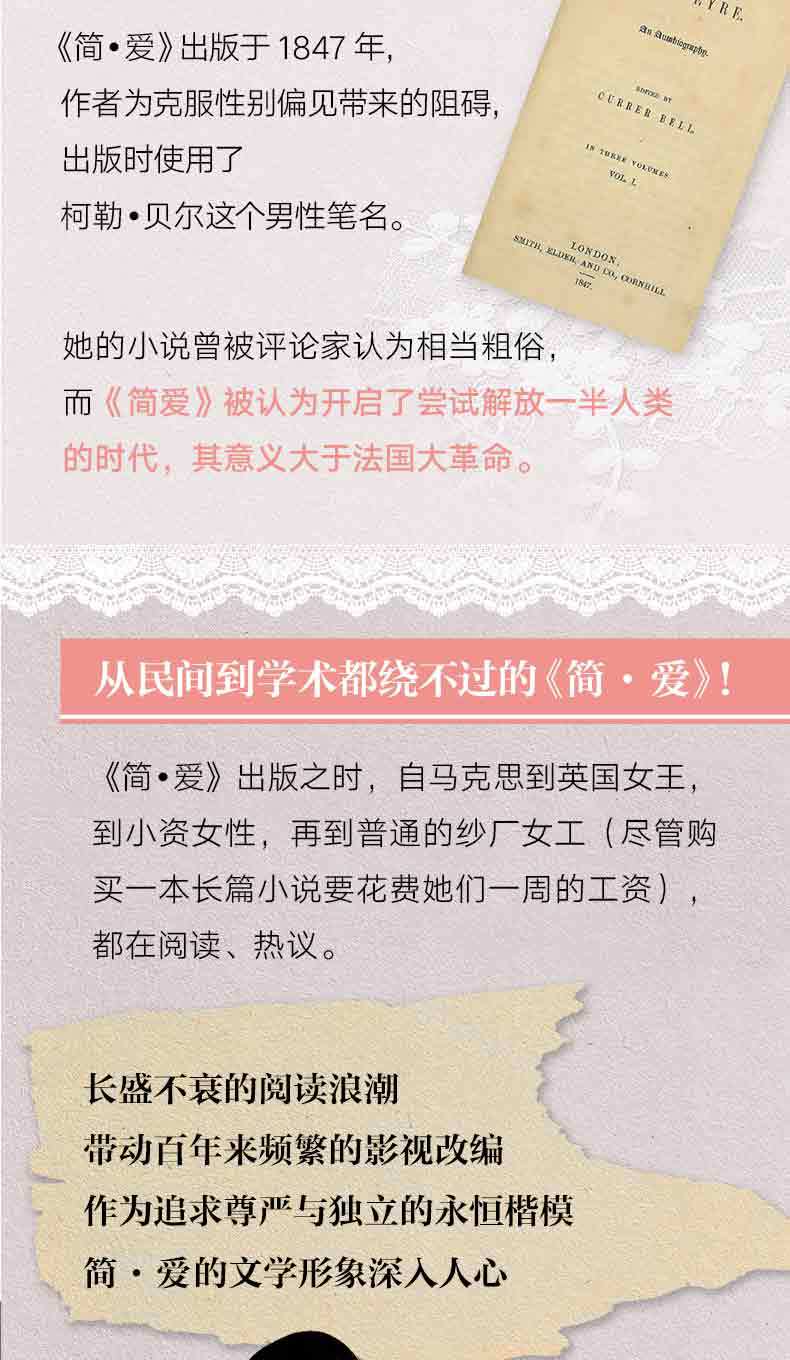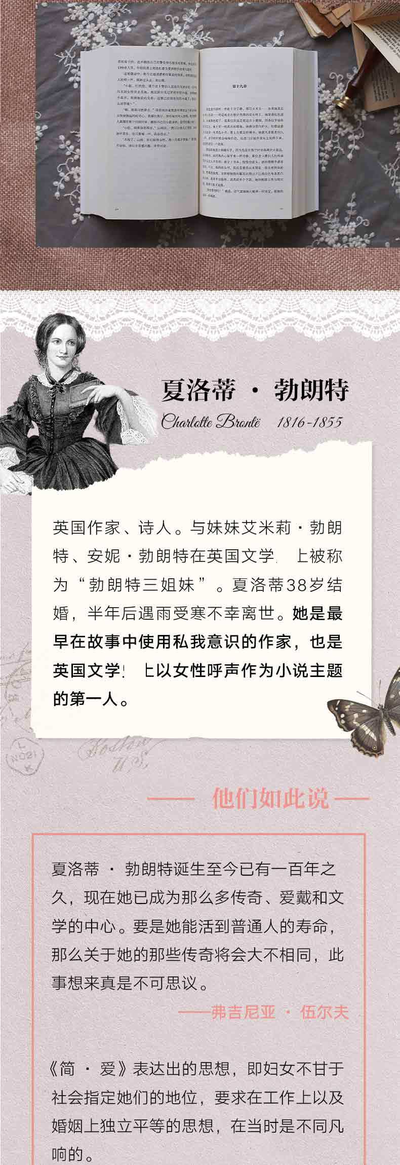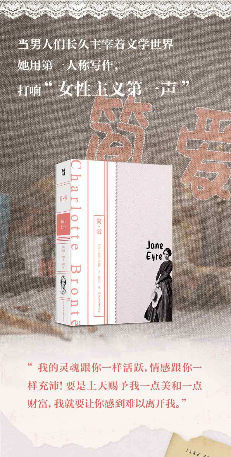 Charlotte disse uma vez às suas irmãs: "Eu criarei uma heroína para vocês. Ela será baixa e feia como eu, mas será tão interessante quanto qualquer uma de suas heroínas." Jane Eyre nasceu. Nos últimos duzentos anos, Jane Eyre tem sido popular. A história de Jane Eyre e Rochester não é apenas uma história de amor, mas também uma história sobre os esforços de uma mulher para explorar uma mente mais ampla. Jane Eyre foi publicada em 1847. Para superar os obstáculos trazidos pelo preconceito de gênero, a autora usou o pseudônimo Currer Bell ao publicar.