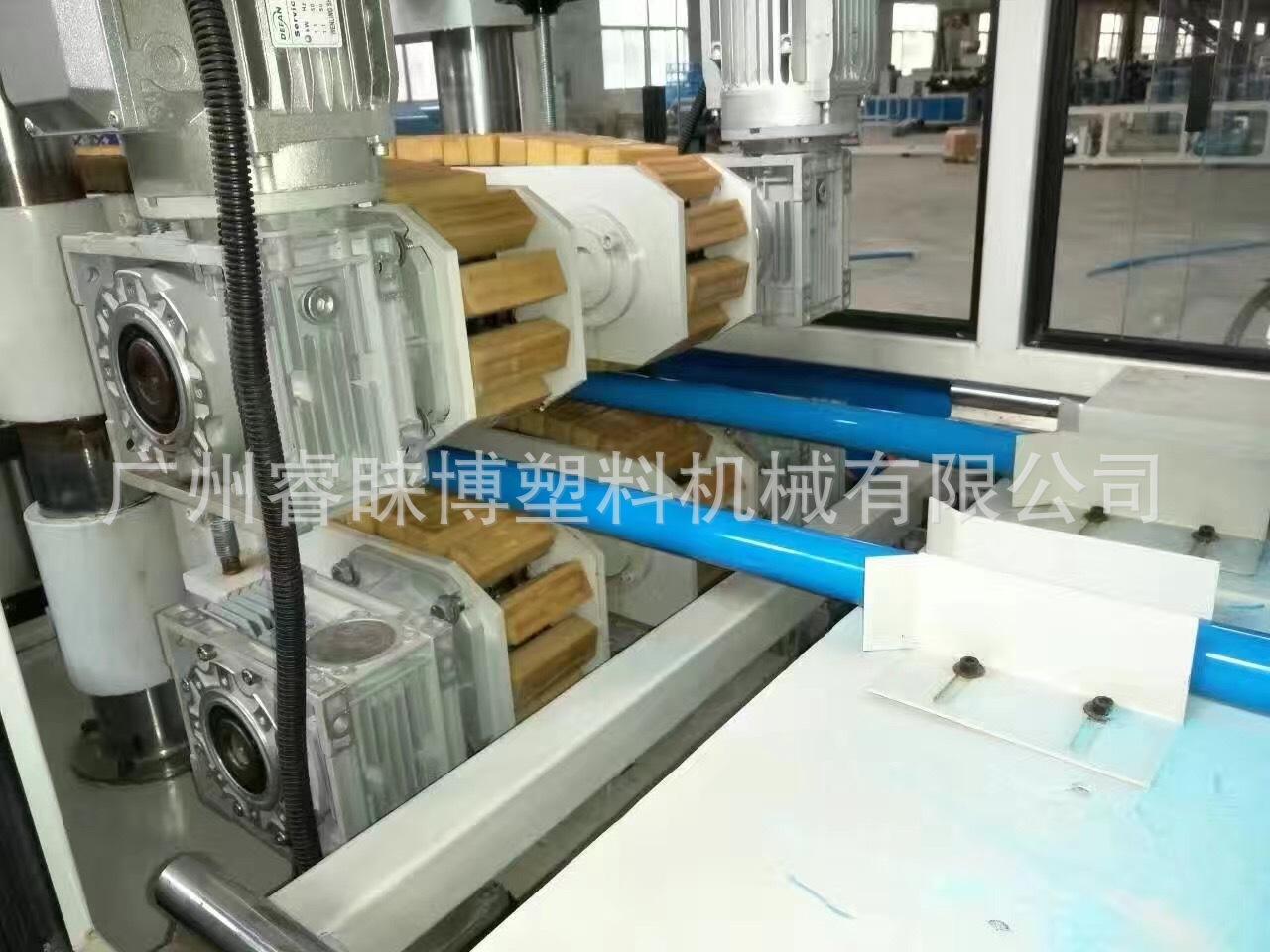 (5) A máquina de tração da linha de produção de extrusão de tubo de plástico PVC é usada para conduzir contínua e automaticamente o tubo resfriado e endurecido para fora da cabeça da máquina, com regulação de velocidade de frequência variável.