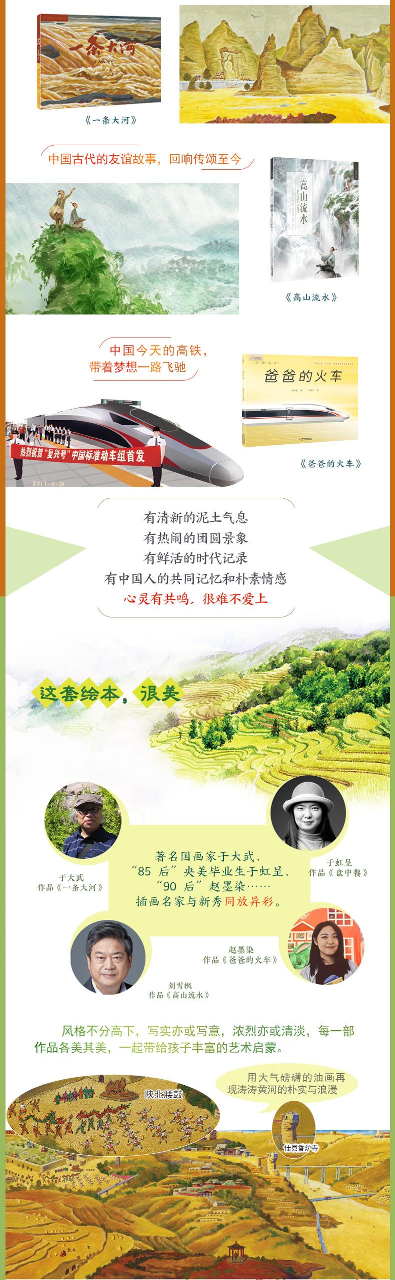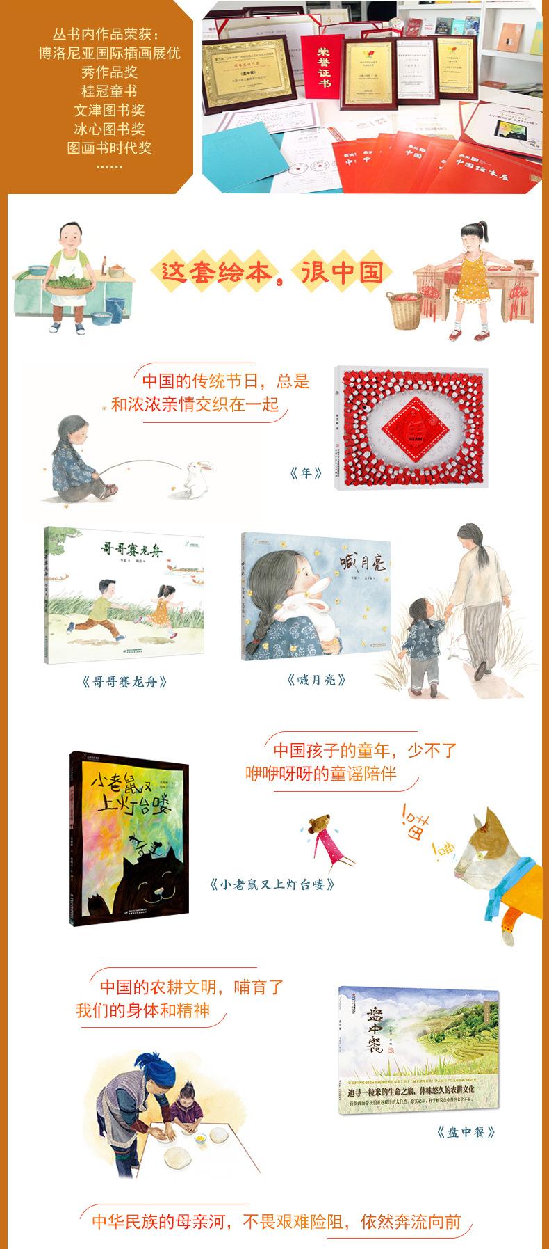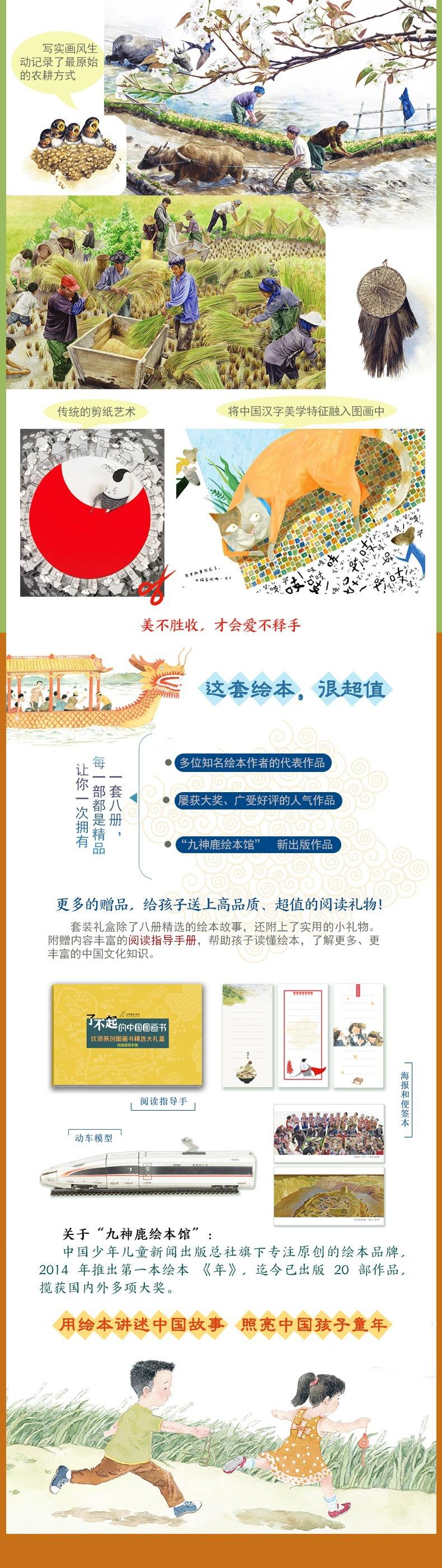 "Amazing Chinese Picture Books" é um conjunto original de livros ilustrados, que seleciona 8 livros ilustrados originais da Jiushenlu Picture Book Library: "Food on the Plate", "New Year", "The Little Mouse Goes to the Lampstand Again", "A Big River", "High Mountains and Flowing Water", "Brother Racing Dragon Boats", "Calling the Moon" e "Dad's Train". Entre eles, "Food on the Plate" e "A Big River" usam a forma de livros ilustrados infantis para levar as crianças a embarcar em uma jornada natural, registrar diferentes histórias de vida e explorar a natureza magnífica da China. Os dois livros ilustrados ganharam muitos prêmios nacionais e internacionais e receberam um feedback muito bom do mercado. "New Year" e "The Little Mouse Goes to the Lampstand Again" são interpretações inovadoras de contos populares e canções de ninar. "High Mountains and Flowing Water" é uma das séries de livros ilustrados de música antiga chinesa, contando as histórias por trás da música antiga chinesa de maior circulação. É um livro ilustrado de música que pode ser lido, ouvido e apreciado. "Brother Racing Dragon Boats" e "Calling the Moon" são livros ilustrados com temas de festivais tradicionais chineses, e as histórias da perspectiva das crianças são cheias de diversão infantil. "Dad's Train" apresenta o desenvolvimento e as mudanças da indústria ferroviária da China por meio da jornada de busca de sonhos do pai maquinista. Vem com um guia de leitura interessante, aprofundado e rico em conteúdo para ajudar as crianças a entender os livros ilustrados e aprender mais e mais rico conhecimento cultural chinês.