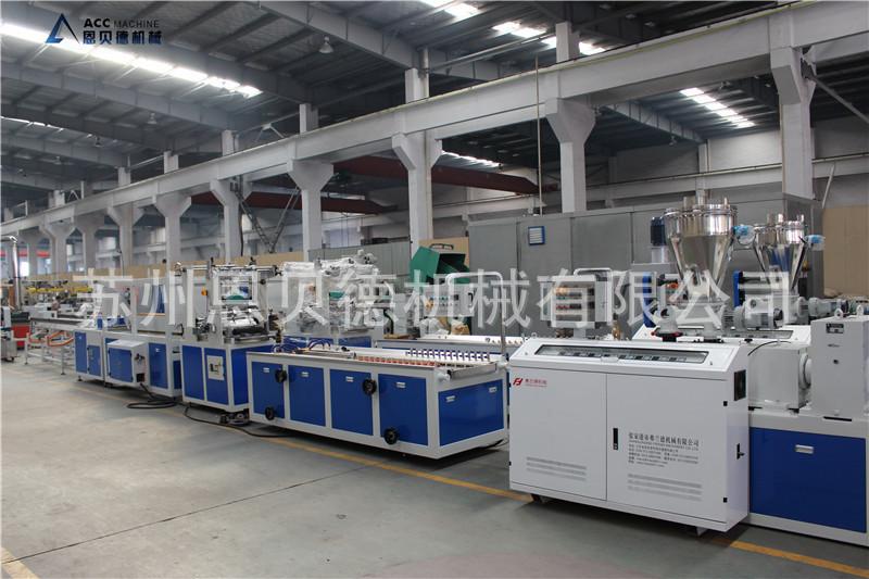 A linha de produção de reforço decorativo de PVC é composta por equipamento de mistura de matéria-prima, equipamento de linha de produção de chapas, equipamento de reciclagem de resíduos e equipamento auxiliar de produção. A linha de produção de chapas é composta por uma extrusora de plástico cônica de parafuso duplo, um molde, uma mesa de moldagem a vácuo, uma máquina de tração, uma máquina de corte, uma máquina de transferência (ou uma máquina de laminação, uma unidade de impressão offline) e um rack de giro de material. A mistura de matéria-prima é composta por um alimentador de matéria-prima e uma unidade de mistura de plástico de alta velocidade. O equipamento de reciclagem de resíduos é composto por um triturador de plástico, um moedor de plástico, etc. O equipamento auxiliar de produção é principalmente o equipamento de fornecimento de água, eletricidade e gás na área da fábrica.
