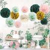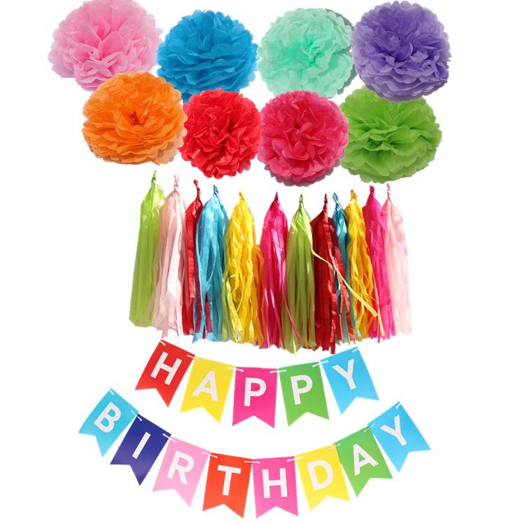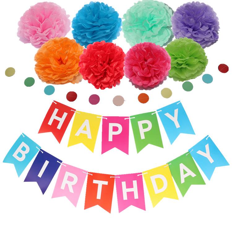 O conjunto colorido inclui: 8 bolas de flores de papel de 10 polegadas: (1 rosa * 10" + 1 azul-celeste * 10" + 1 verde-menta * 10" + 1 roxo claro * 10" + 1 laranja * 10" + 1 vermelho * 10" + 1 vermelho-rosa * 10" + 1 verde-fruta * 10") + bandeira com letras douradas de feliz aniversário + 1 barbante de papel redondo (colorido como mostrado) 2 metros de comprimento 22 peças