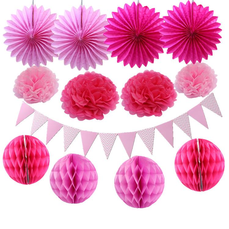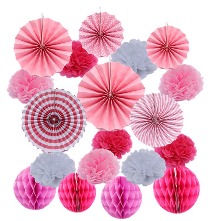 9 bolas de flores de papel: (10"*3 rosa + 10"*3 branco + 10"*3 vermelho rosa) 4 bolas de favo de mel (8"*2 rosa + 8"*2 vermelho rosa)1 conjunto de 6 flores de leque de papel (2 de 20 cm + 2 de 30 cm + 2 de 40 cm)