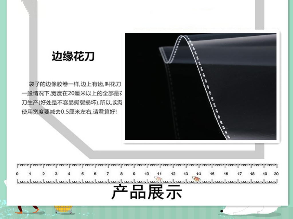 5. Acabamento da bolsa; geralmente tamanhos com menos de 15cm de largura usam faca plana, sem orifícios de ar, geralmente tamanhos com mais de 15cm de largura são faca de flor (ou seja, borda à prova de explosão), alguns também têm orifícios de ventilação perfurados para facilitar o uso! Devido à baixa precisão da máquina, um erro de tamanho de 2 a 3 milímetros no tamanho da bolsa é normal