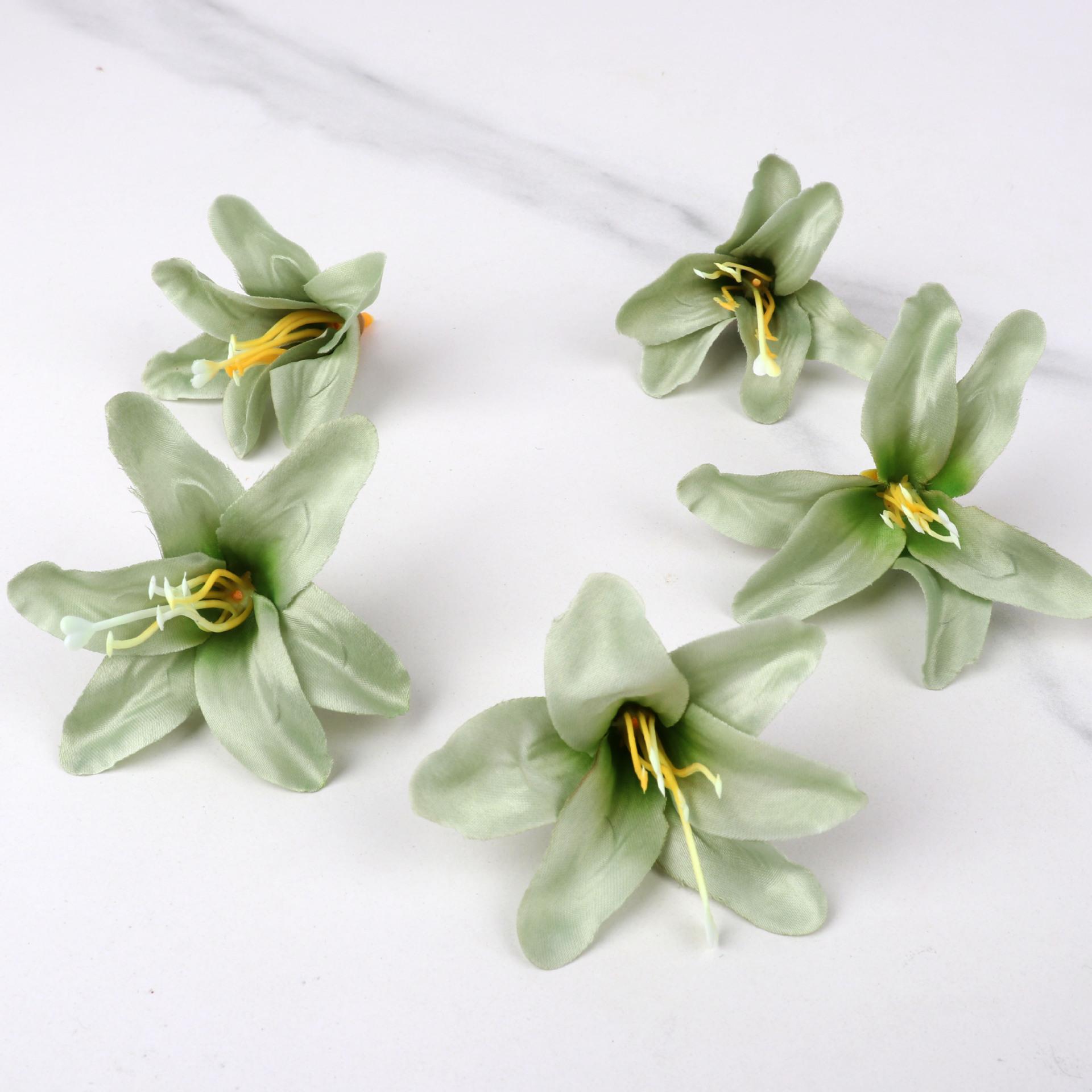 Nome: Cabeça de flor de lírio artificial Material: Seda Especificações: Diâmetro da cabeça da flor cerca de 7 cm Aplicação: materiais artesanais, acessórios de cabelo, etc. Peso: Uma flor pesa cerca de 1 grama