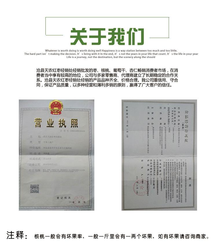 As tâmaras, nozes, passas e amêndoas vendidas e vendidas no atacado pelo Tiannong Jujube Distribution Office no Condado de Cang são populares no mercado consumidor e desfrutam de um alto status entre os consumidores. A empresa estabeleceu relações cooperativas estáveis e de longo prazo com muitos varejistas e agentes. Os produtos distribuídos pelo Tiannong Jujube Distribution Office no Condado de Cang são completos em variedade e razoáveis em preço. Nossa empresa valoriza o crédito, cumpre contratos, garante a qualidade do produto e conquistou a confiança dos clientes com o princípio de operação diversificada e pequenos lucros, mas giro rápido.