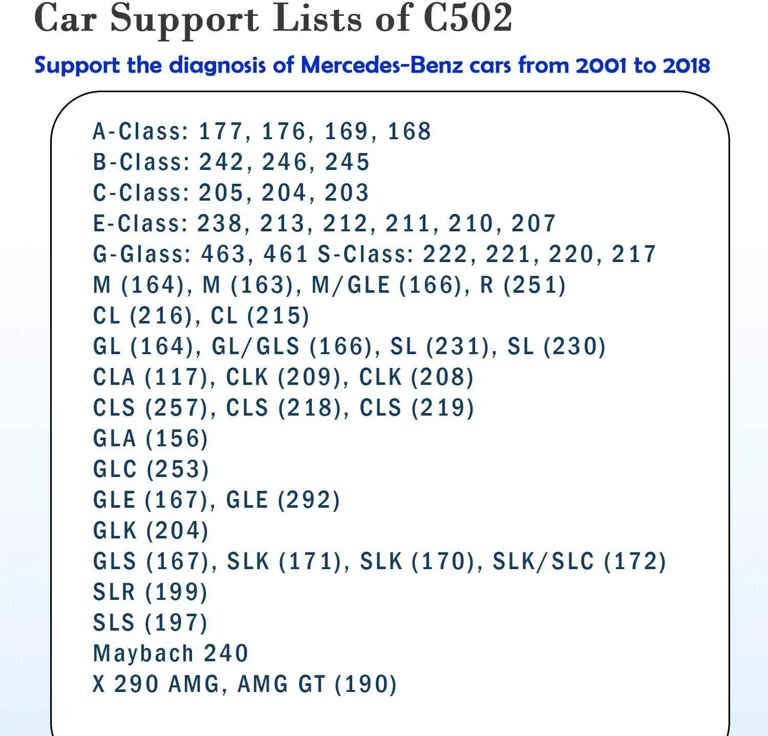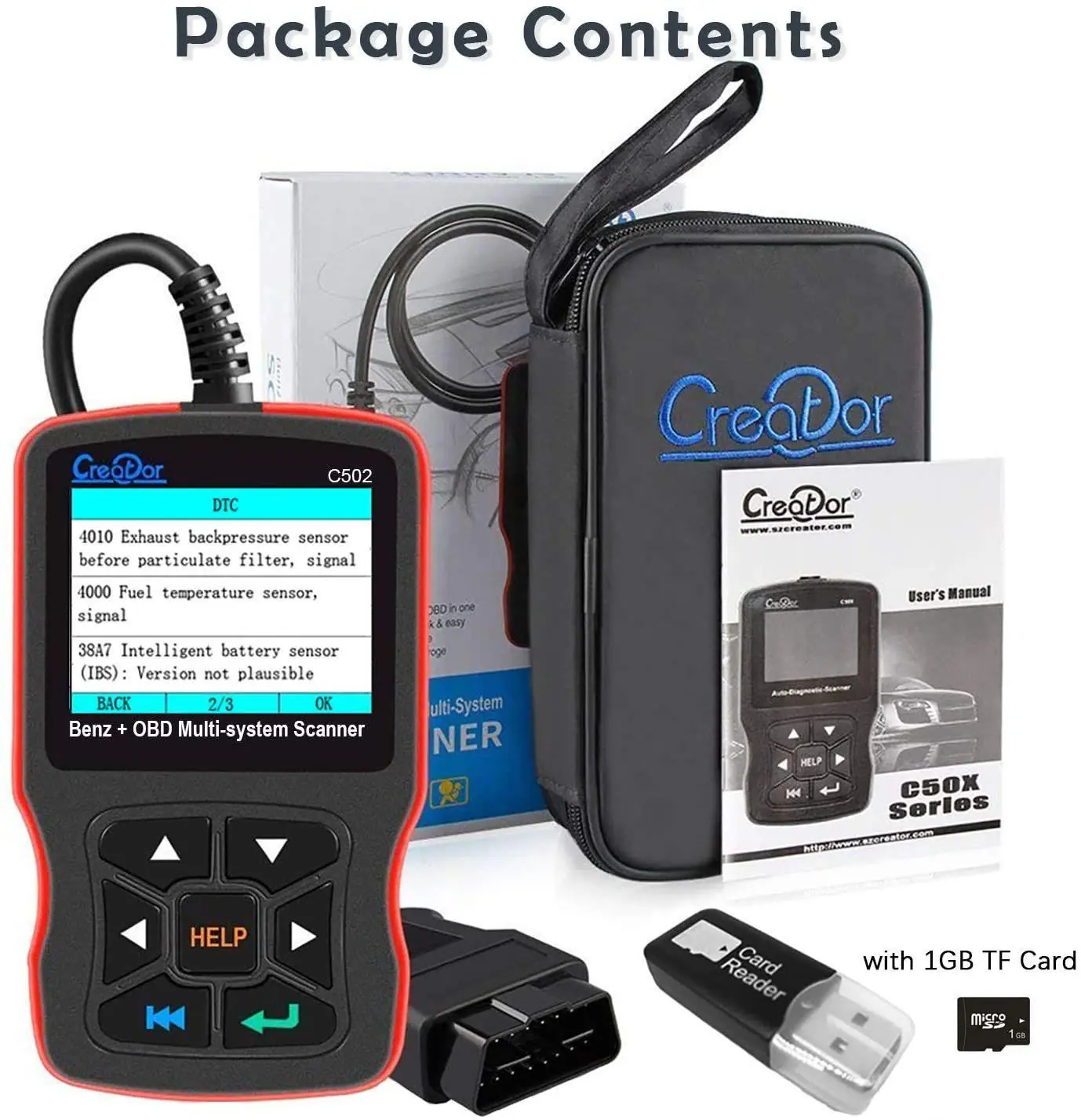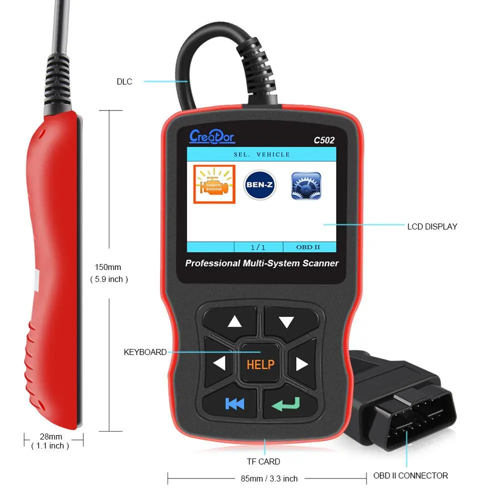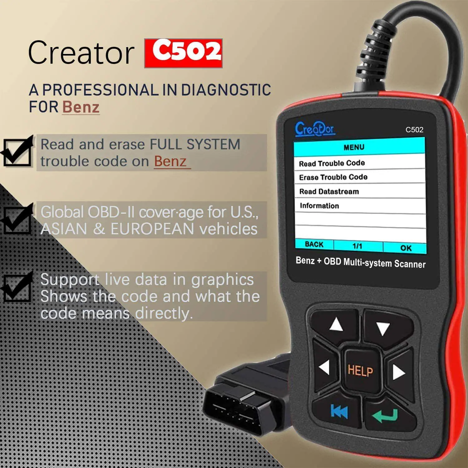 O Creator C502 é um novo scanner de código OBDII com recursos, focado principalmente na indústria de diagnóstico de carros BENZ, ajudando usuários DIY e técnicos profissionais a corrigir problemas no motor do carro e erros relacionados à emissão. Com o novo design patenteado e tela ampla colorida verdadeira, o C502 pode acessar facilmente e rapidamente o sistema de computador do carro (ECU), diagnosticar os problemas do motor e apagá-los com um clique. O C502 seria a melhor solução para usuários domésticos e técnicos profissionais, economizando seu tempo e dinheiro na oficina!