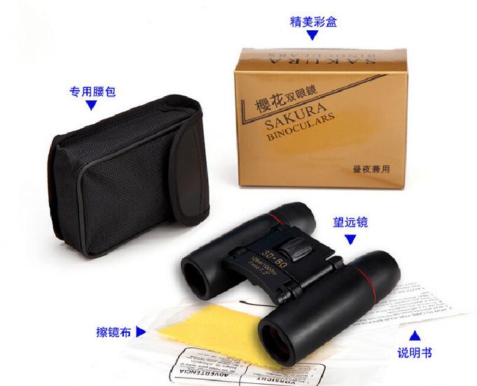 Embalagem: cordão, pano para limpeza de lentes, manual de instruções, bolsa preta de náilon para pendurar e caixa colorida.