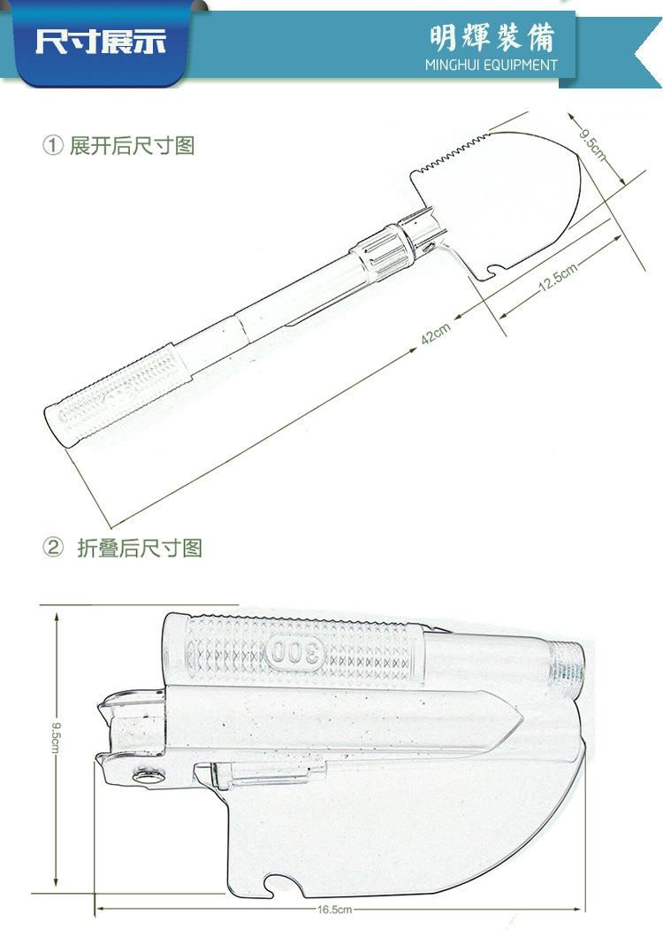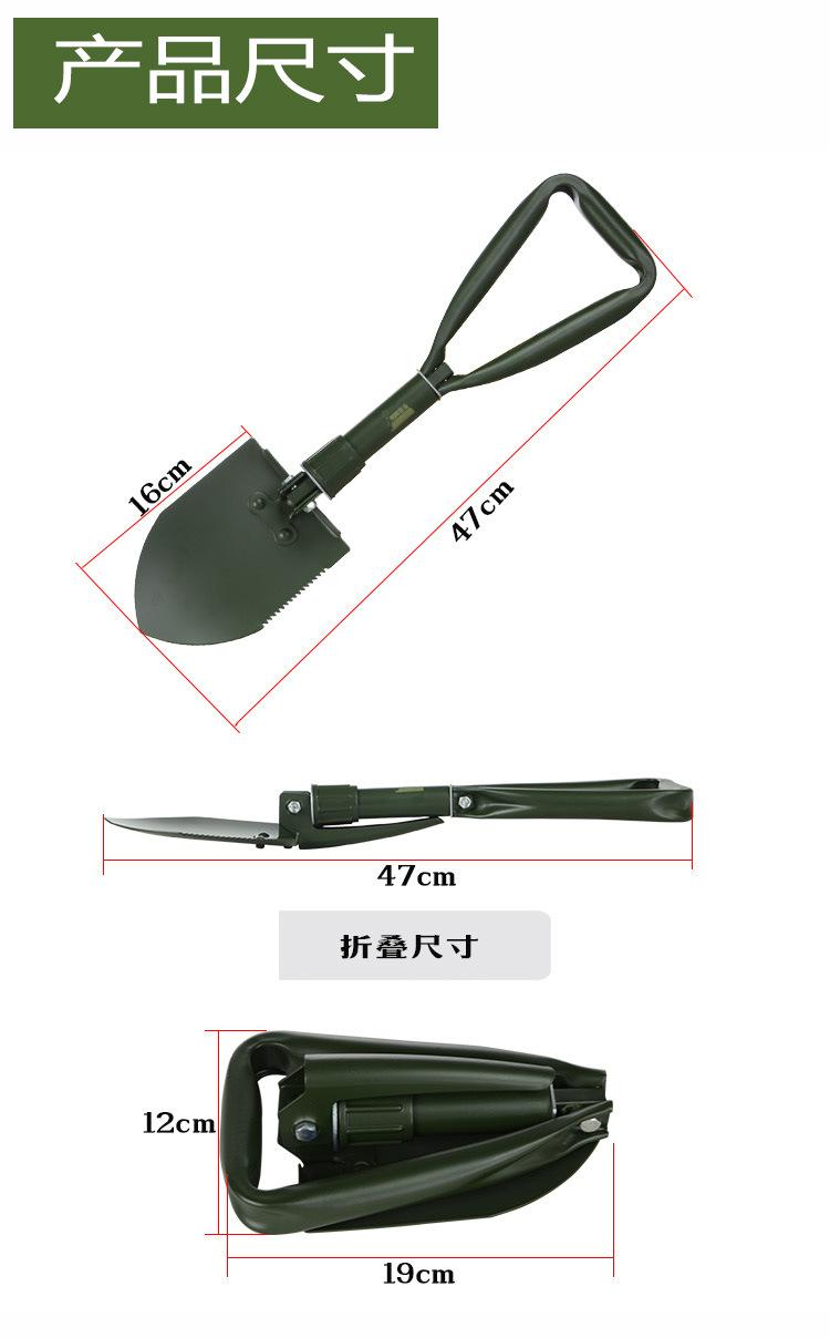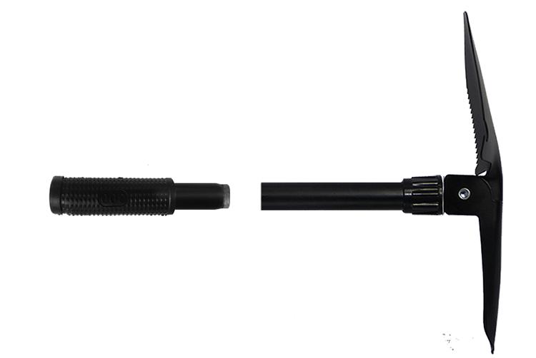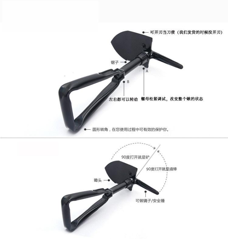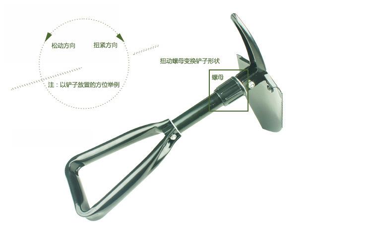Pode ser dobrado, pequeno em tamanho e fácil de carregar. Quando desdobrado, uma ponta é uma pá e a outra ponta é uma picareta.