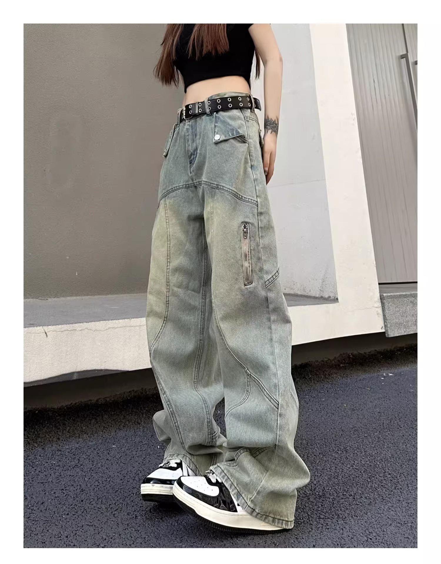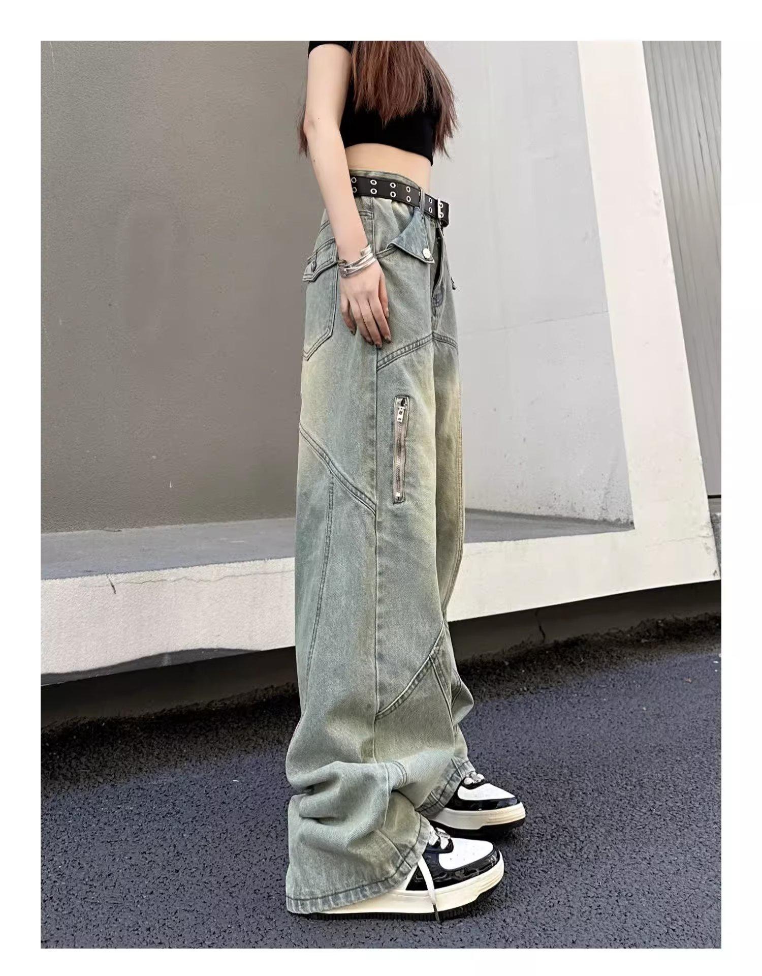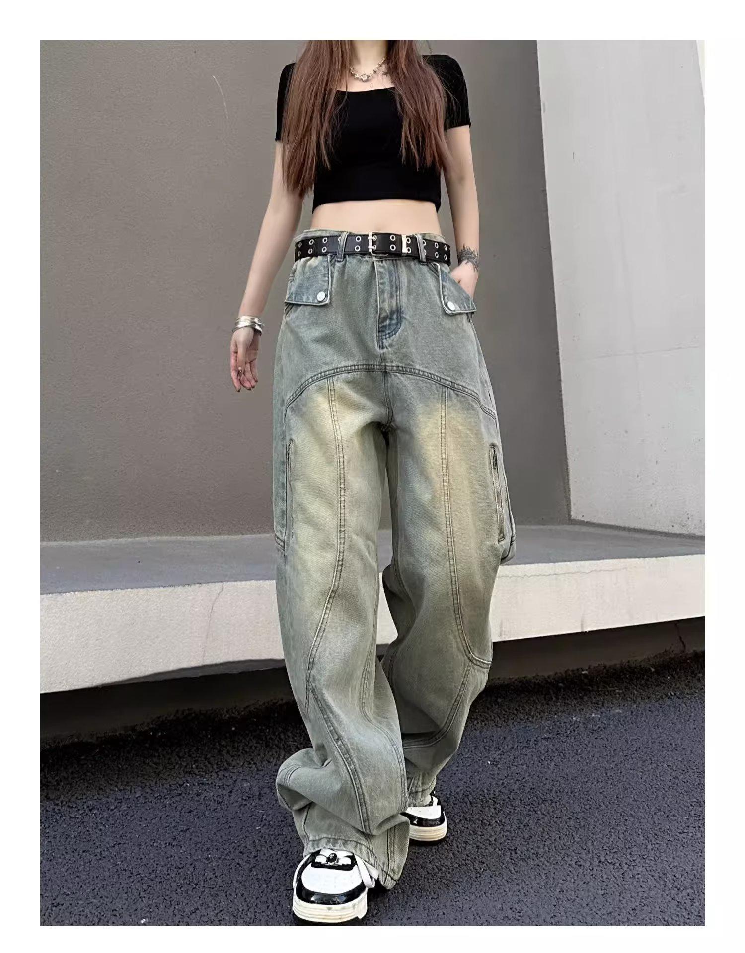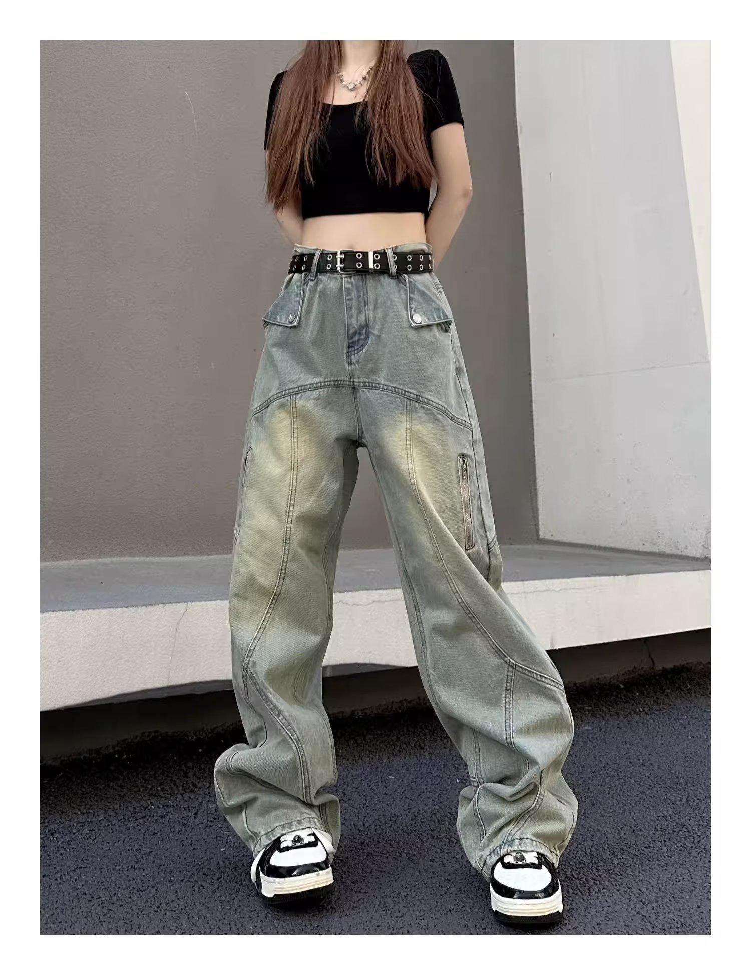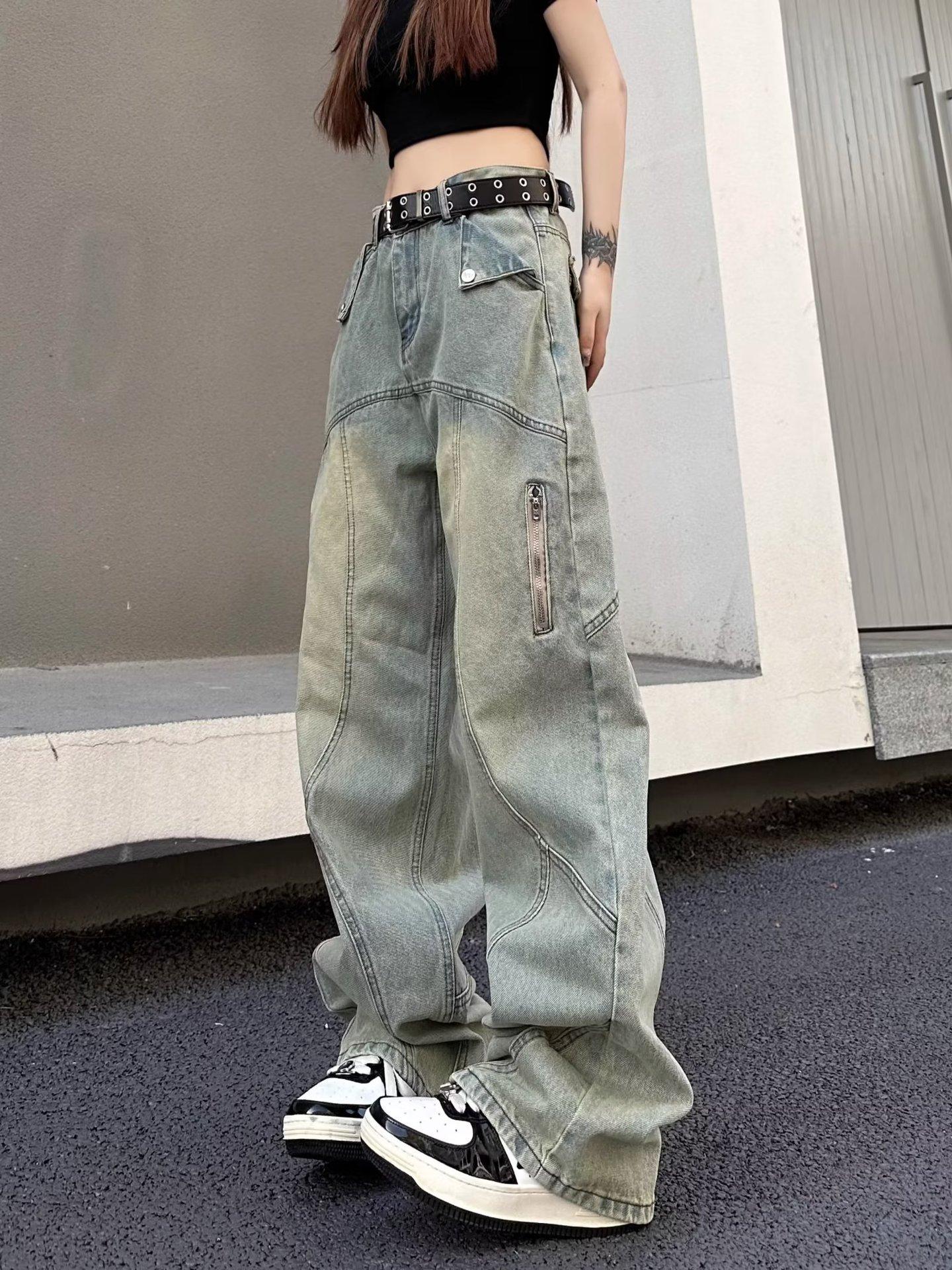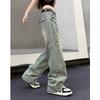 Calça jeans feminina estilo americano com design retrô e pernas largas, cintura alta, estilo hip hop, reta e solta