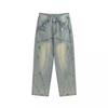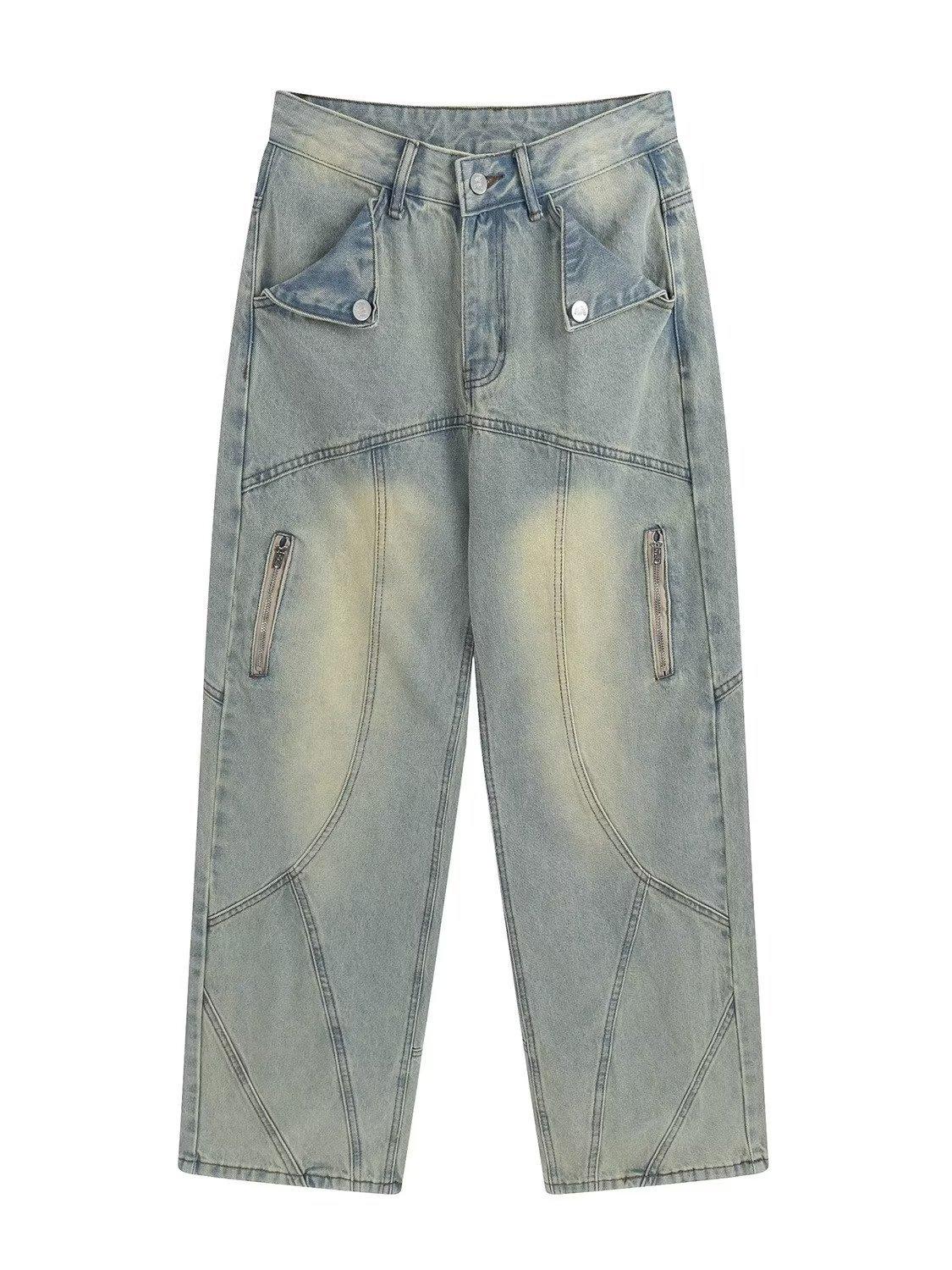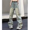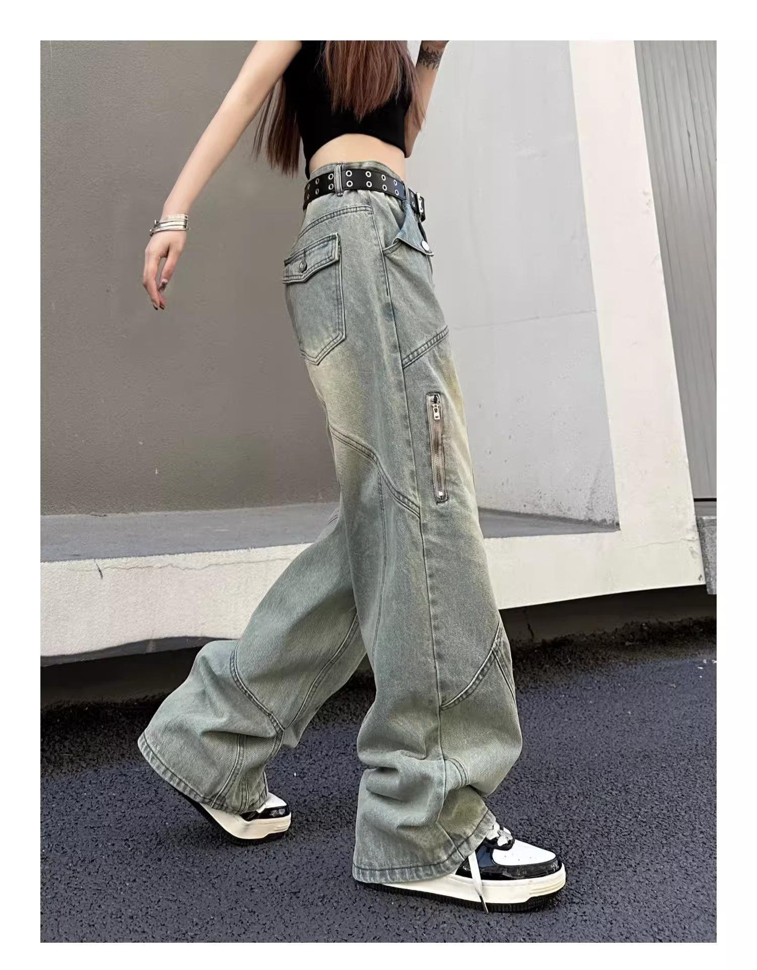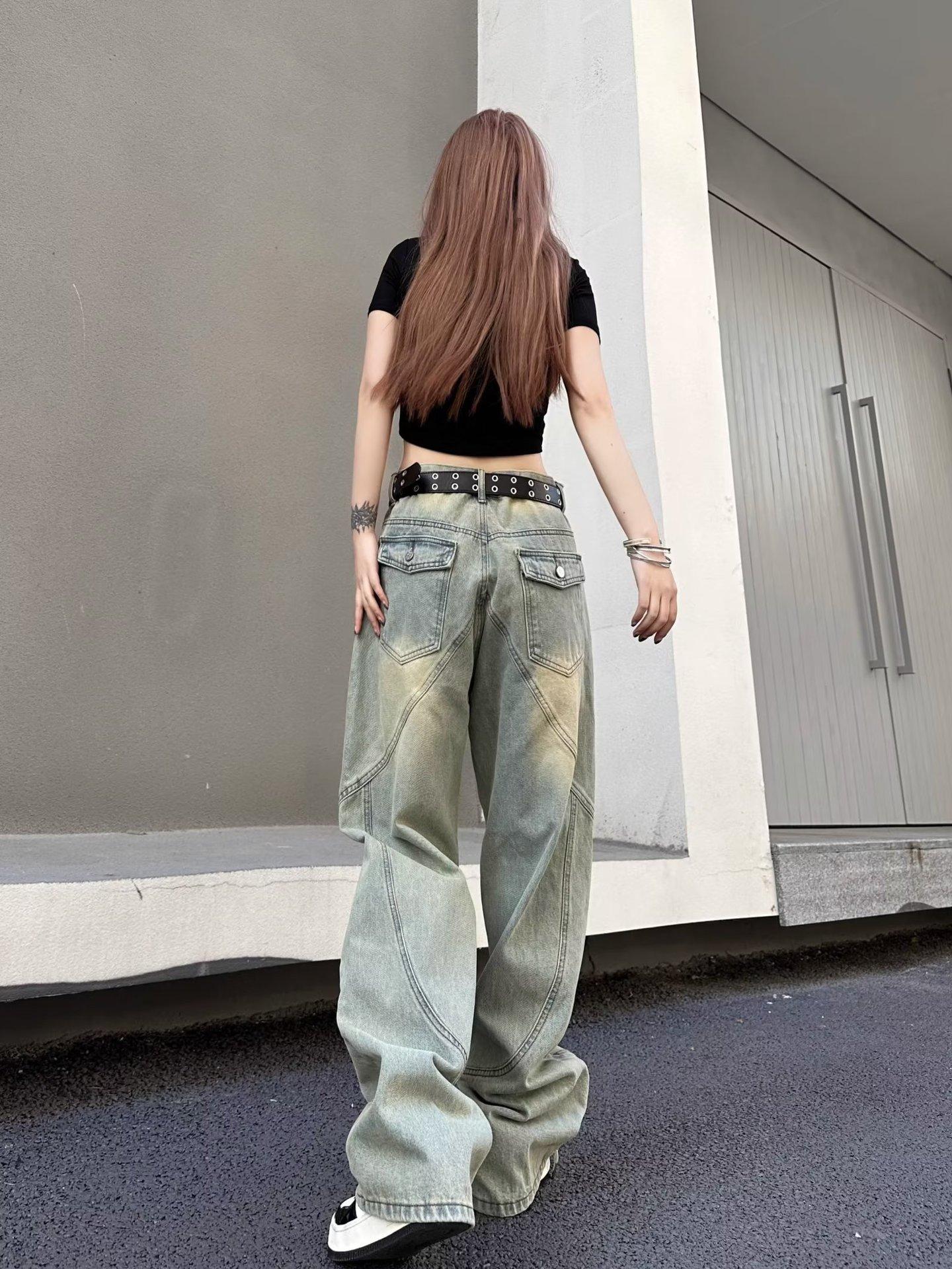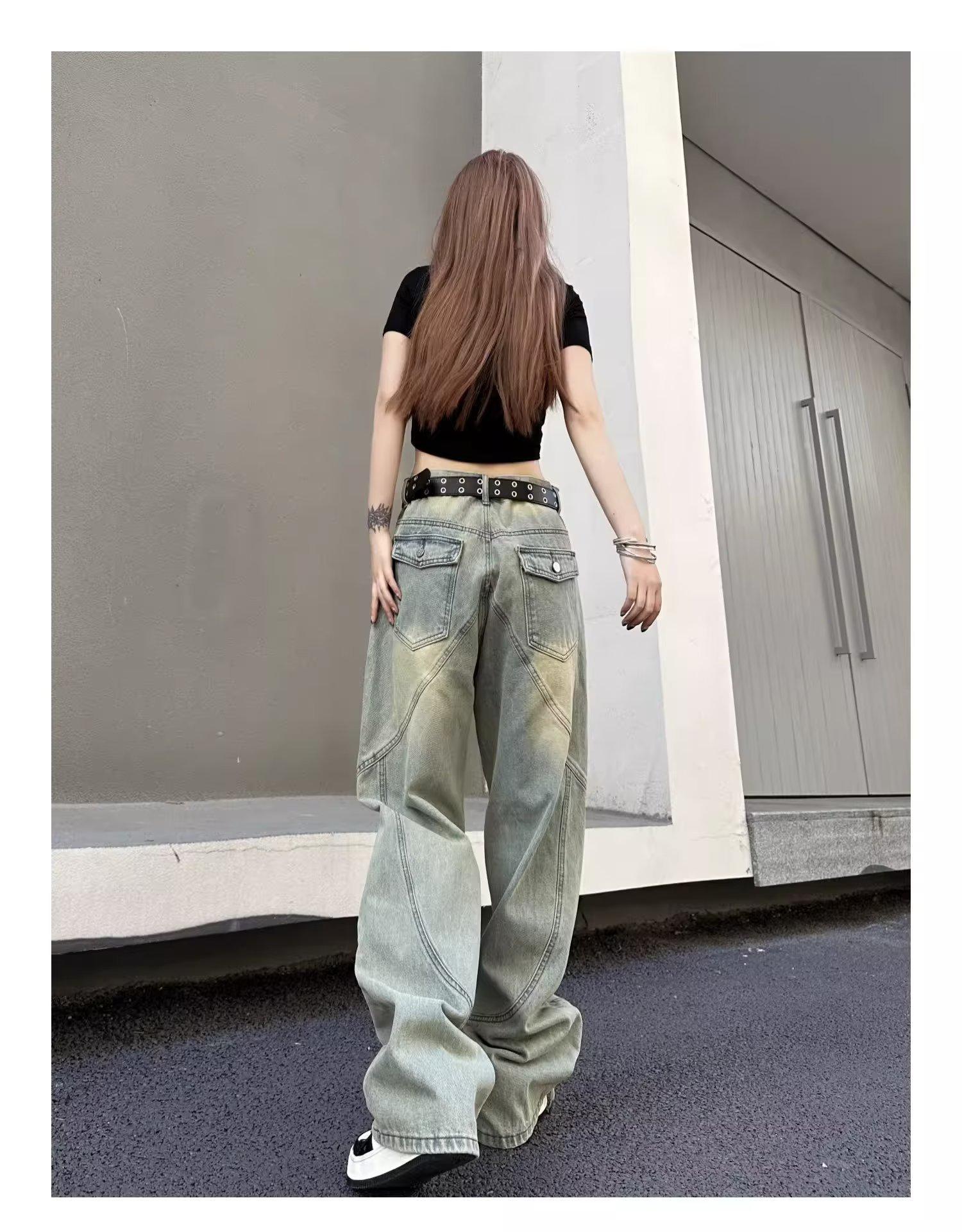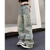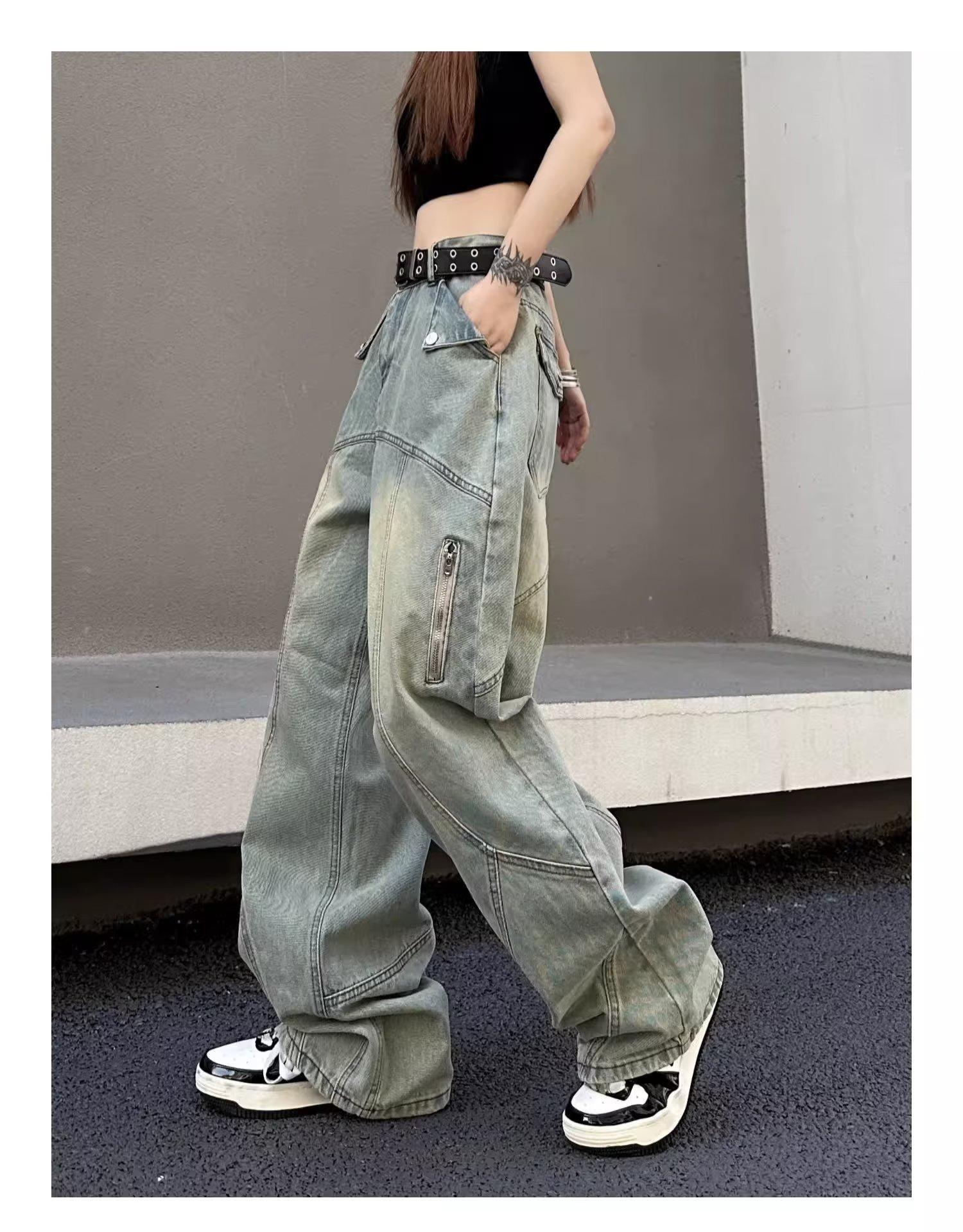 Calça jeans feminina estilo americano com design retrô e pernas largas, cintura alta, estilo hip hop, reta e solta