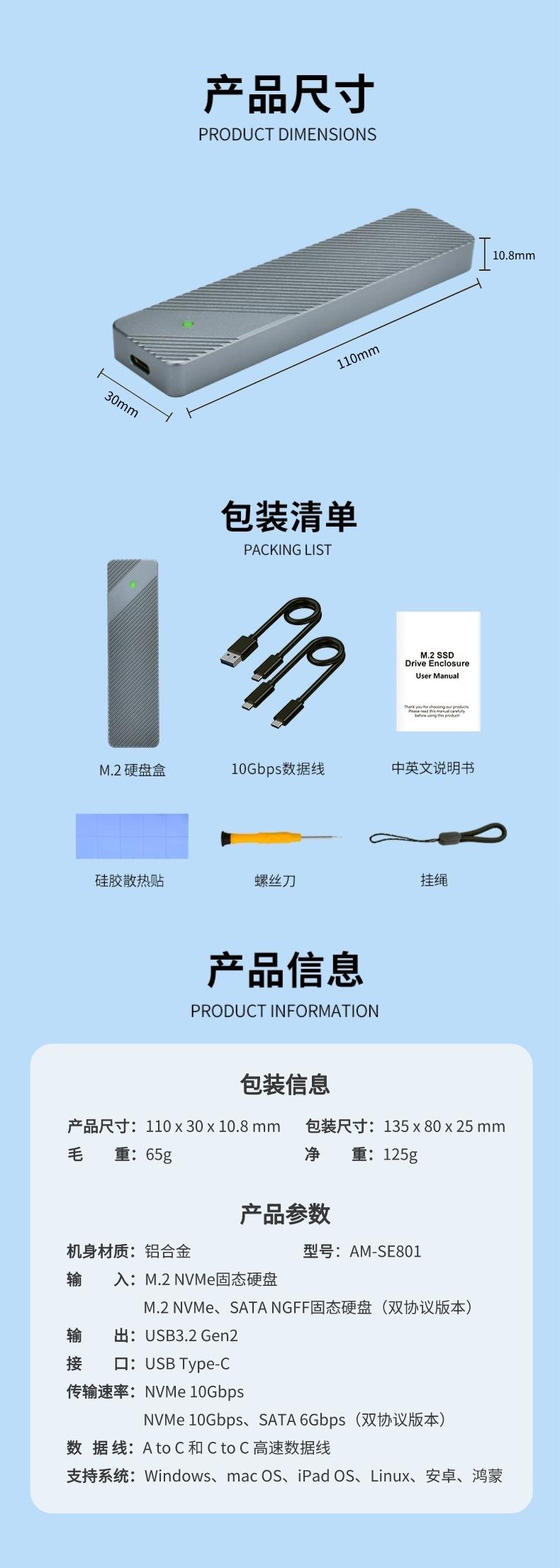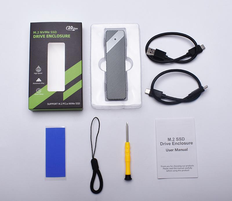 Lista de embalagem: Gabinete SSD M.2, cabo de alta velocidade A para C, cabo de dados de alta velocidade C para C, almofada de silicone térmica, chave de fenda, cordão, manual de instruções em chinês e inglês
