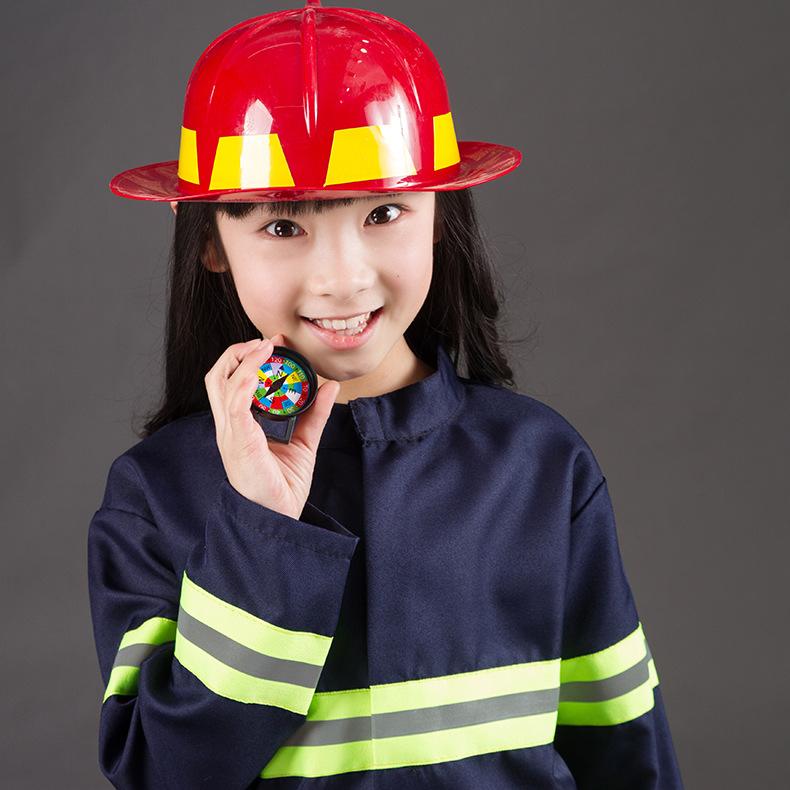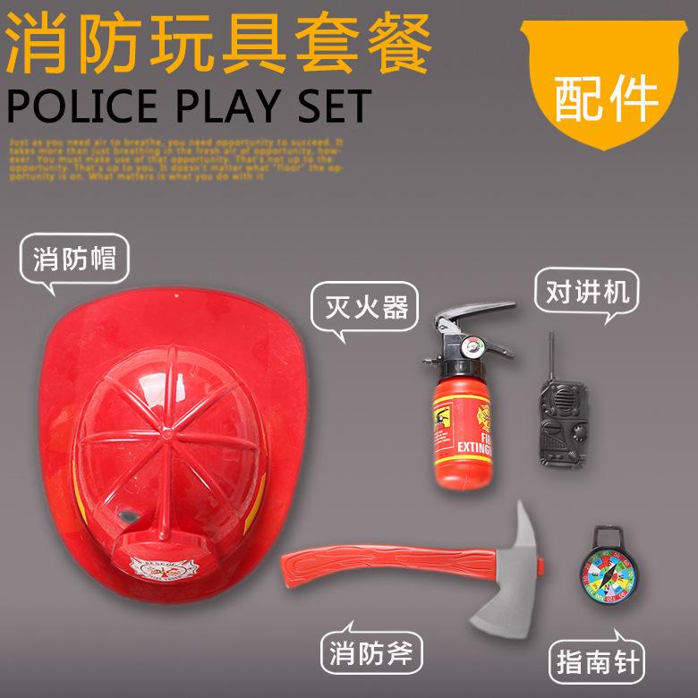 2.O conjunto de brinquedos inclui: chapéu de bombeiro, machado de brinquedo, extintor de incêndio, walkie-talkie e bússola.