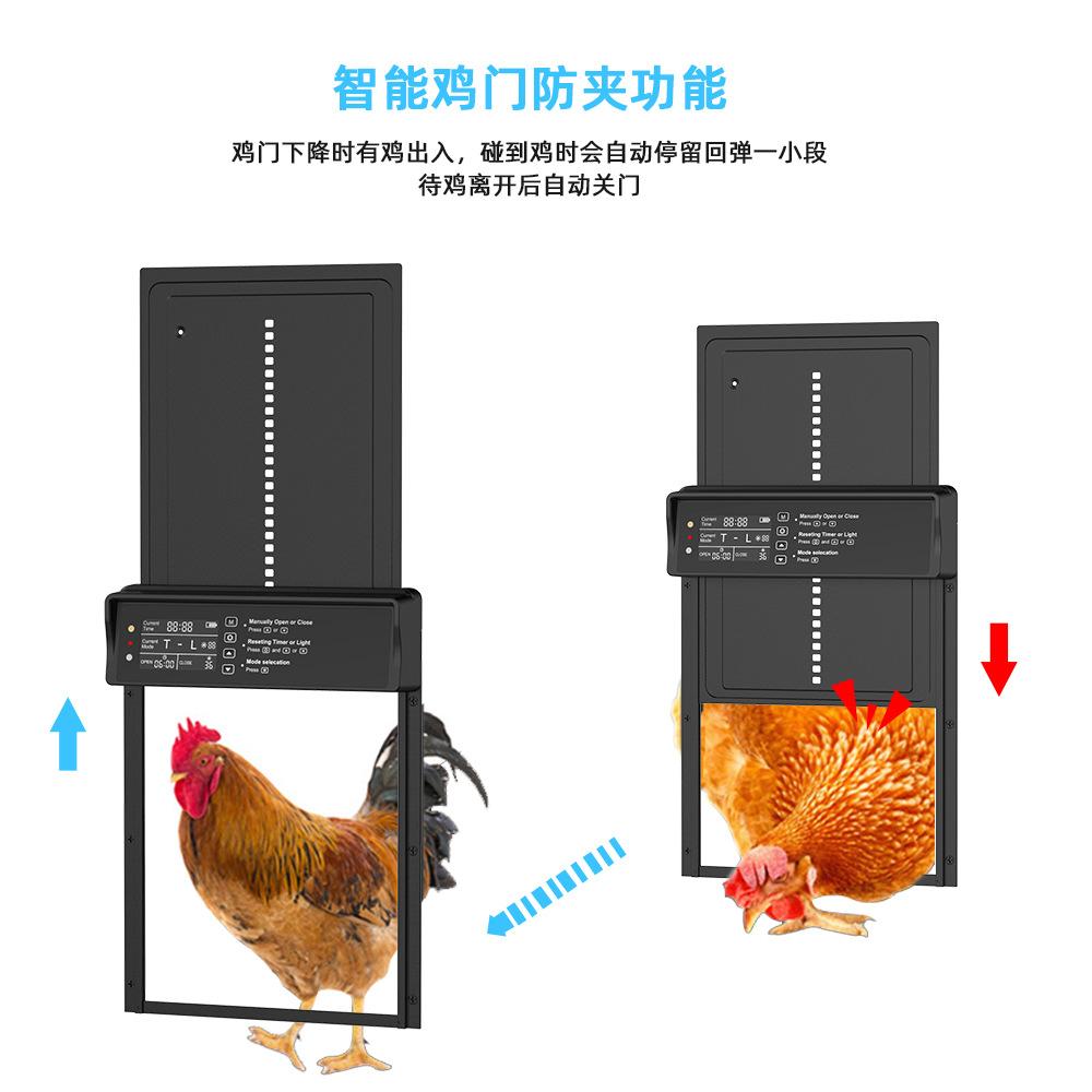 3. Design de proteção anti-esmagamento: Nossa porta de galinheiro adota design anti-esmagamento! Quando o sensor embutido detecta um obstáculo sob a porta, a porta automática para para evitar que as galinhas se machuquem.