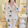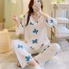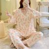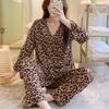 Pijama de seda de algodão feminino Decote em V seda de algodão manga comprida terno de seda de algodão fino roupa da mãe algodão artificial ar condicionado roupa doméstica absorvente de suor