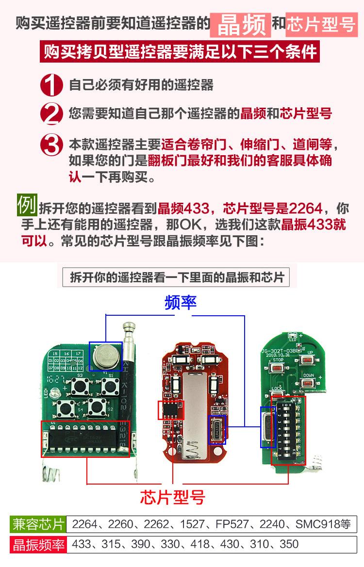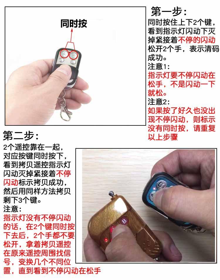 3. Este controle remoto não é um controle remoto universal. Ele só pode copiar controles remotos com IC impresso com PT2262 PT2264 SC2262 SC2260 HS2262 2260 LX2262 2260 EV1527 PT2240 e alguns controles remotos de código não padrão (ele não pode copiar controles remotos com chips de código rolante, como HCS301)
