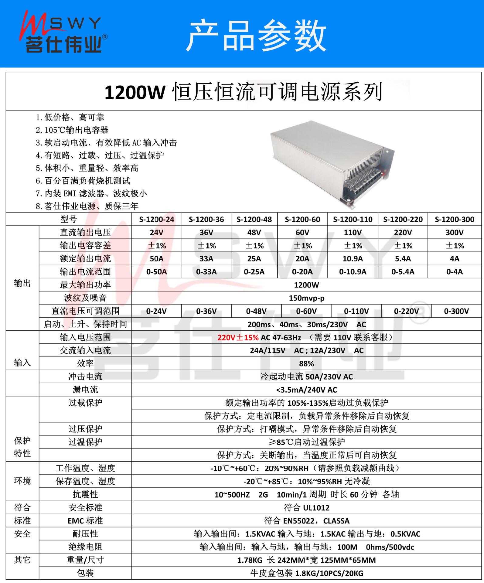 Fonte de alimentação comutada 1200W AC110V/220V, DC24V36V48V72V110V150V220V300V ajustável