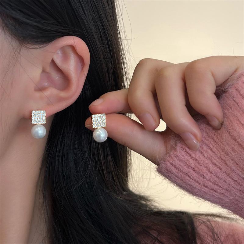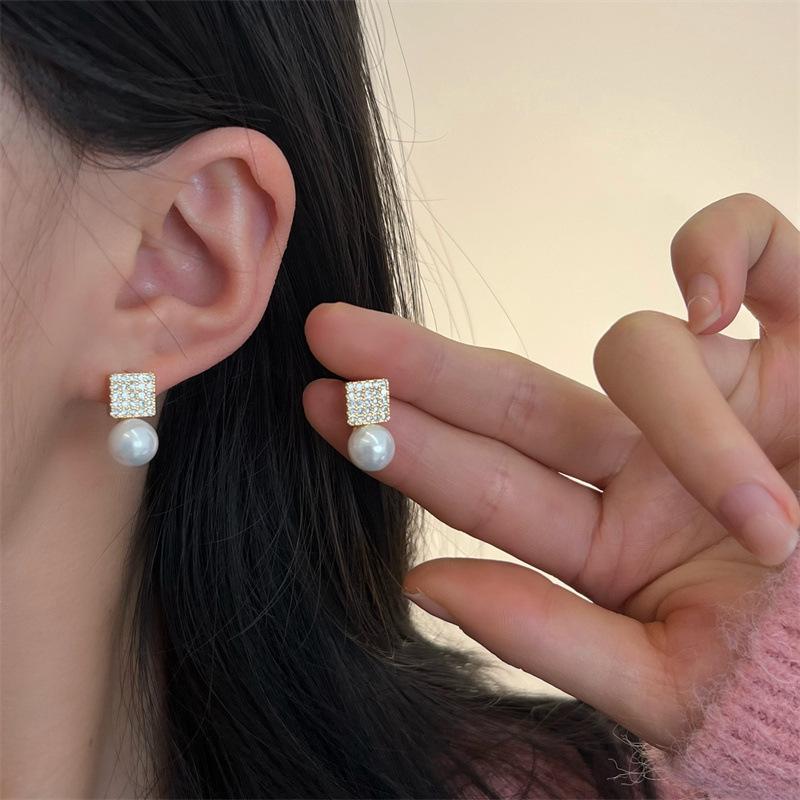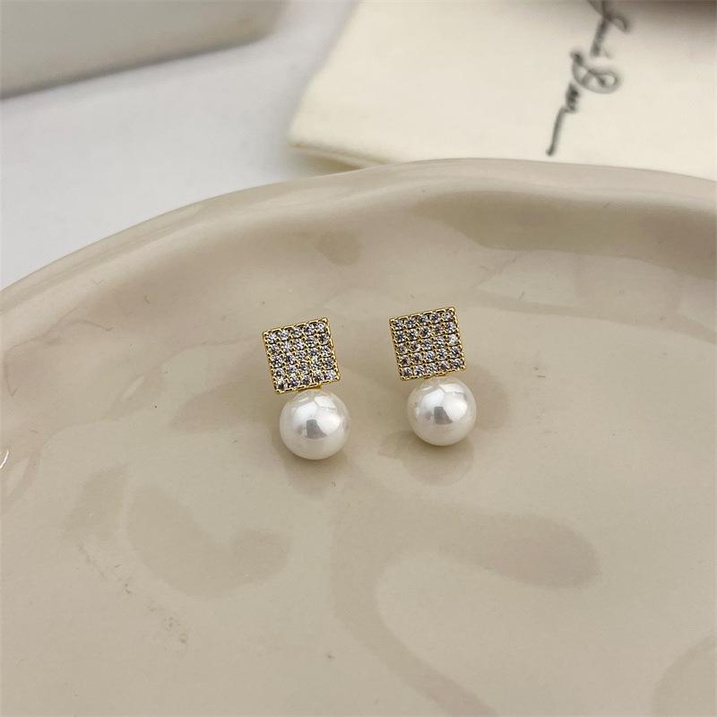 Compre Brincos de pérolas de diamante completo requintado moda elegante para todos os jogos Design Sense Pearl Brincos quadrados micro brincos geométricos no atacado no Joom.pro