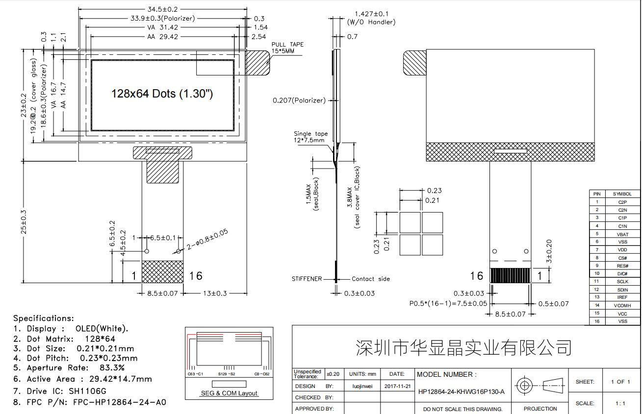 Fábrica de tela LCD LCD 1,3 polegadas OLED display 12864 tela de matriz de pontos tela LCD branca 16PIN