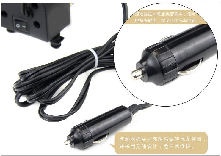 Retire o plugue do isqueiro e insira-o diretamente no isqueiro do carro. Ligue o interruptor da bomba de ar. Depois que a bomba de ar for iniciada, insira o bocal de ar na parte superior da mangueira de enchimento diretamente na válvula do pneu. Quando você ouve o som de ar vazando do pneu, significa que o ar circulou e o bico de ar pode ser apertado para inflar. Neste momento, o ar não vazará mais.