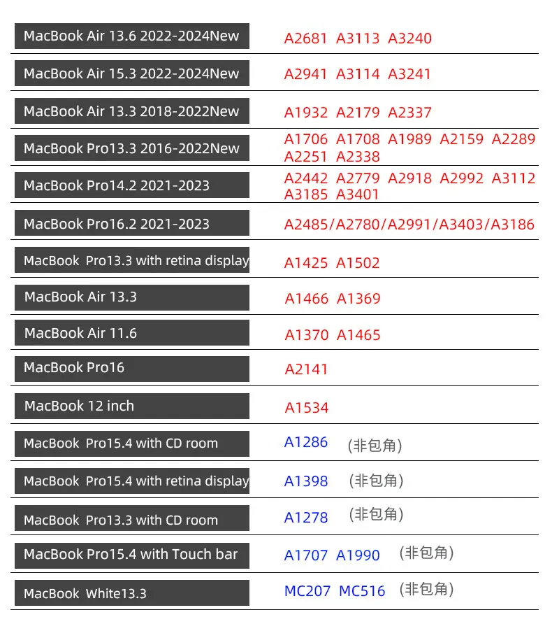 13.3 Pro (13.3Pro A1706/A1708/A1989/A2159/A2338), 13.3Air A1932/A2179/A2337, 13.6Air A2681/A3113/A3240