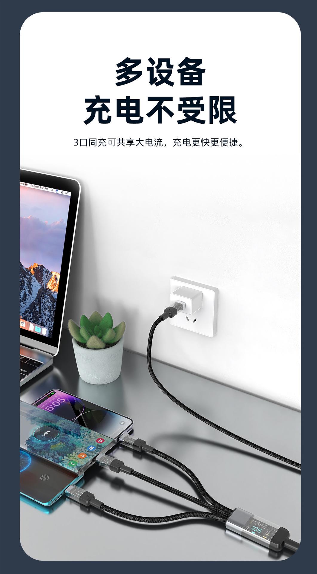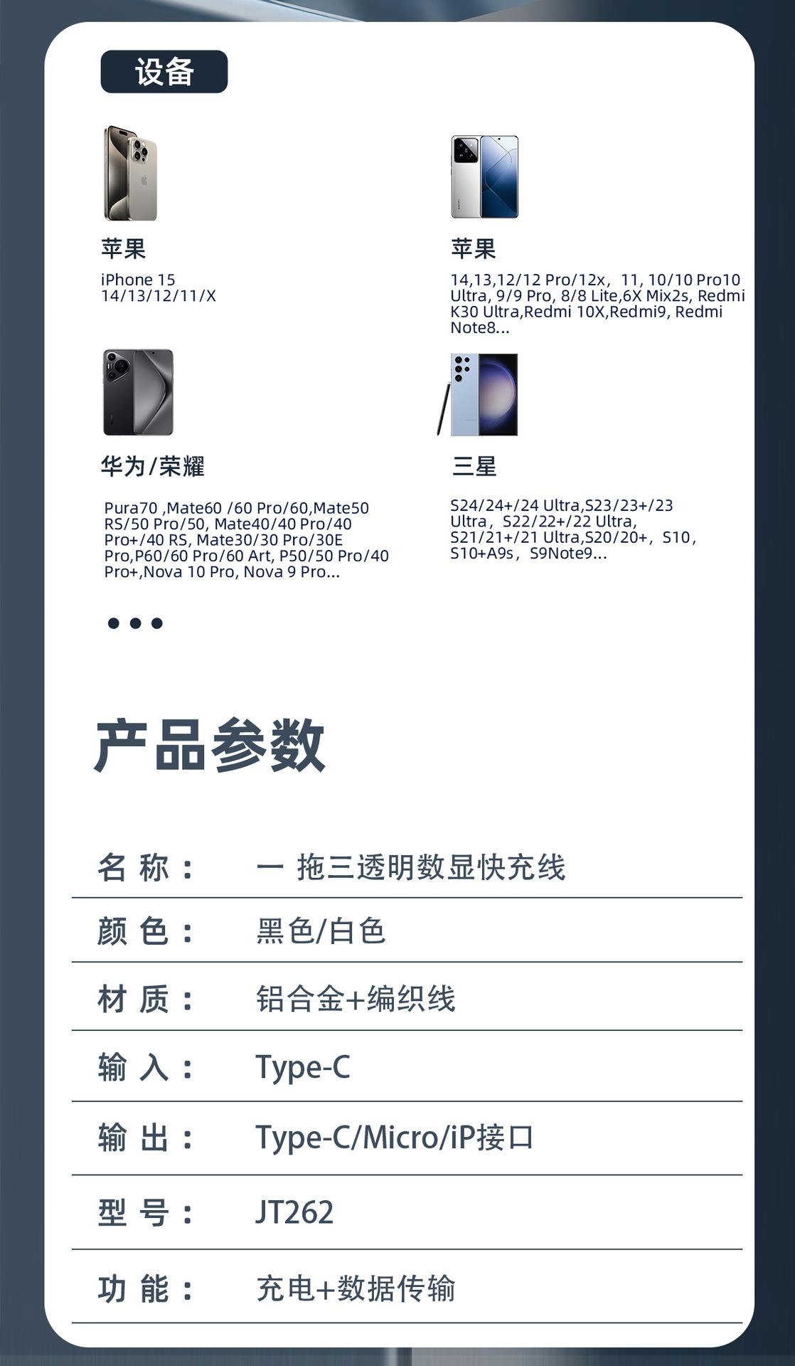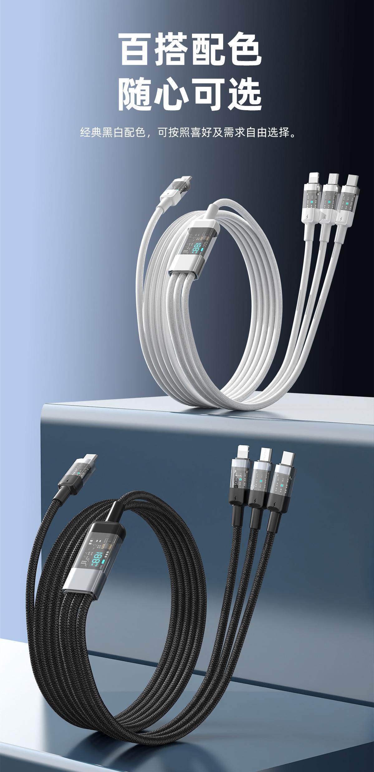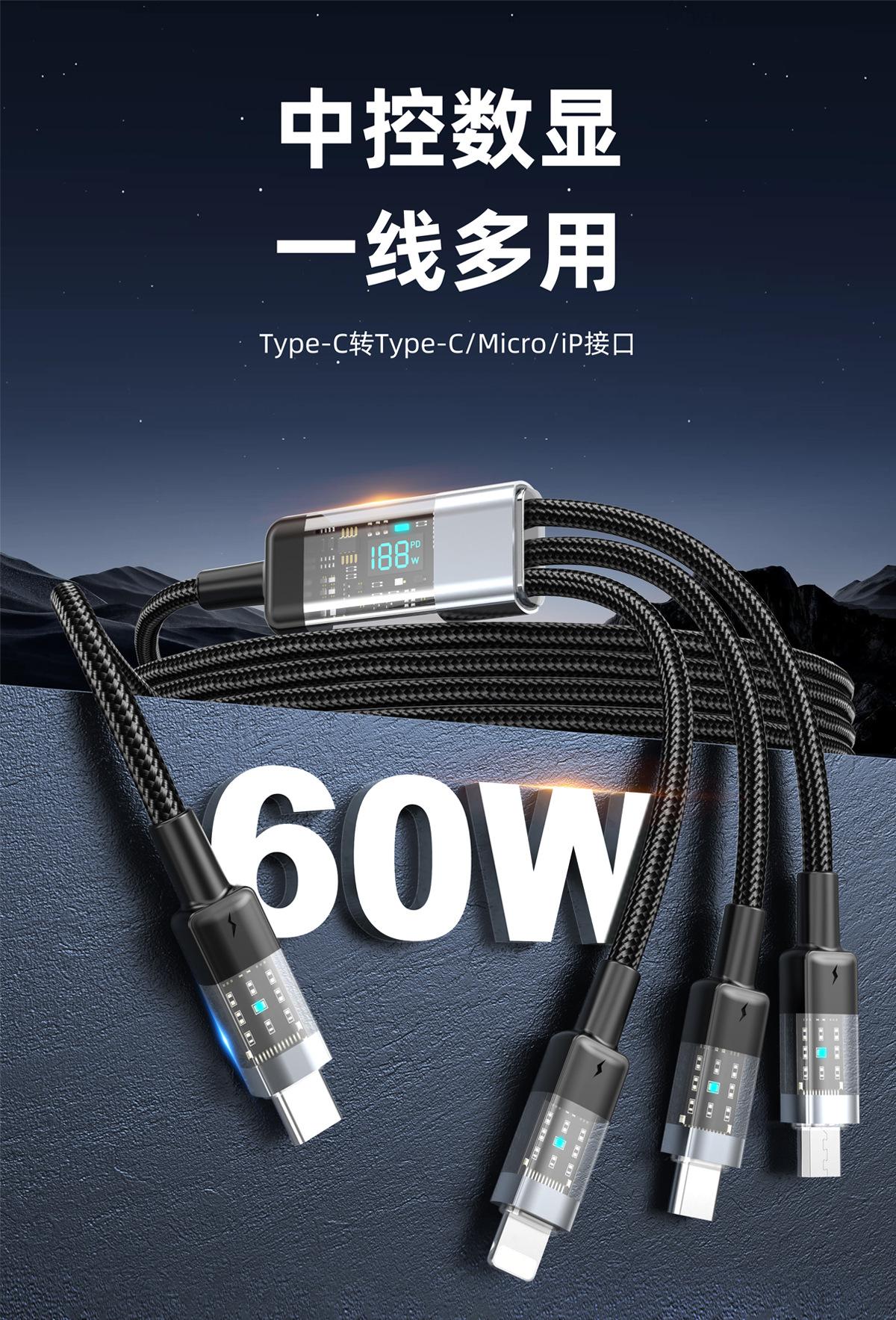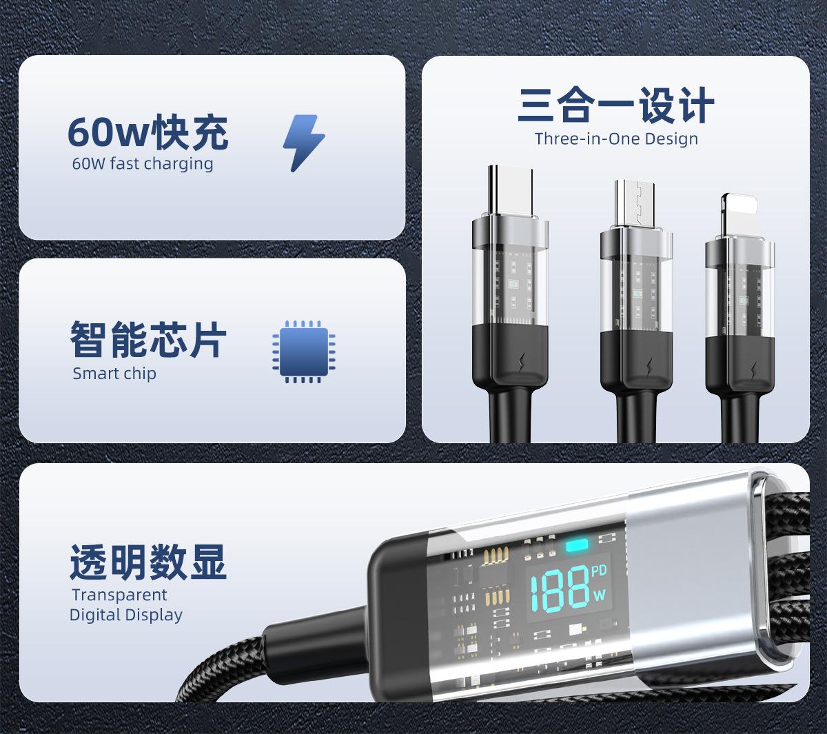 Compre Display digital de um a três cabo de dados 60W carregamento super rápido para Apple Android tipo c cabo de carregamento de celular transparente no atacado no Joom.pro