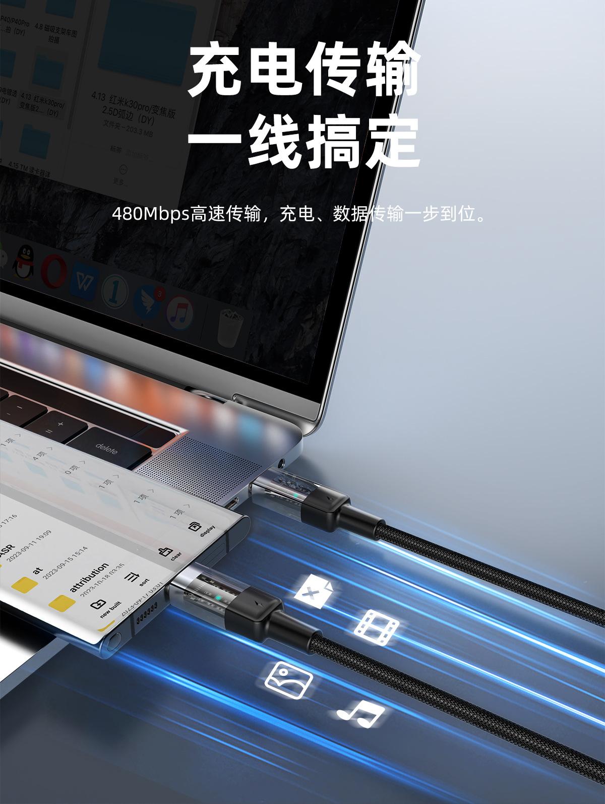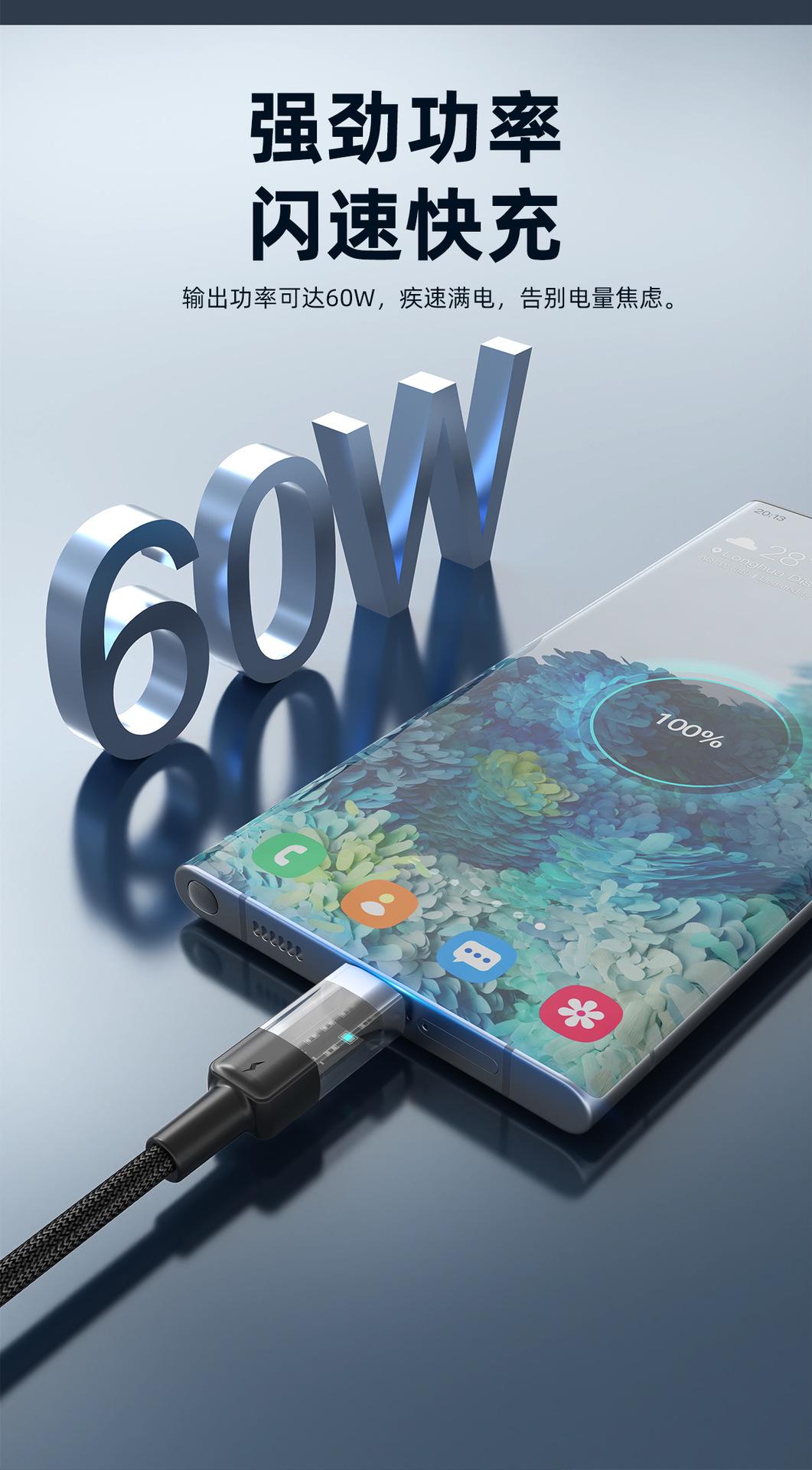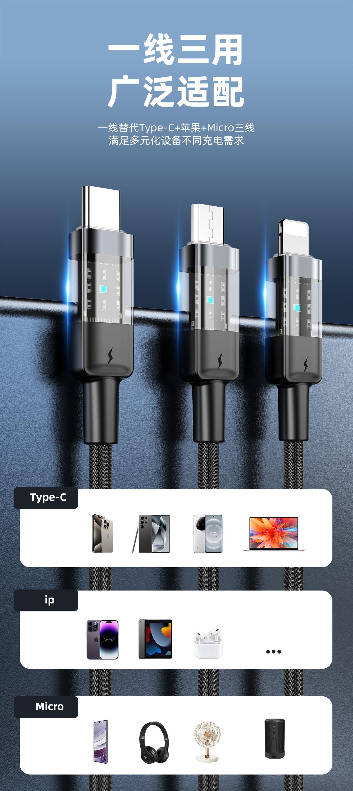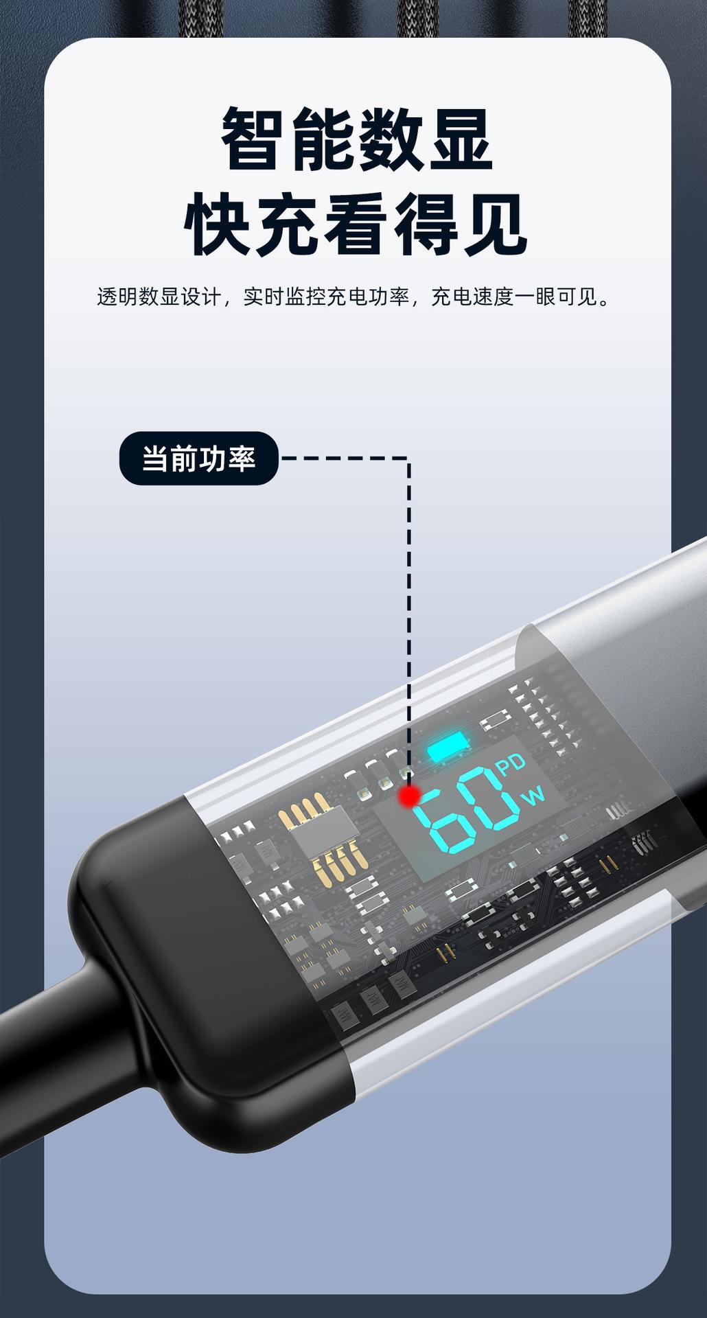Display digital de um a três cabo de dados 60W carregamento super rápido para Apple Android tipo c cabo de carregamento de celular transparente