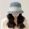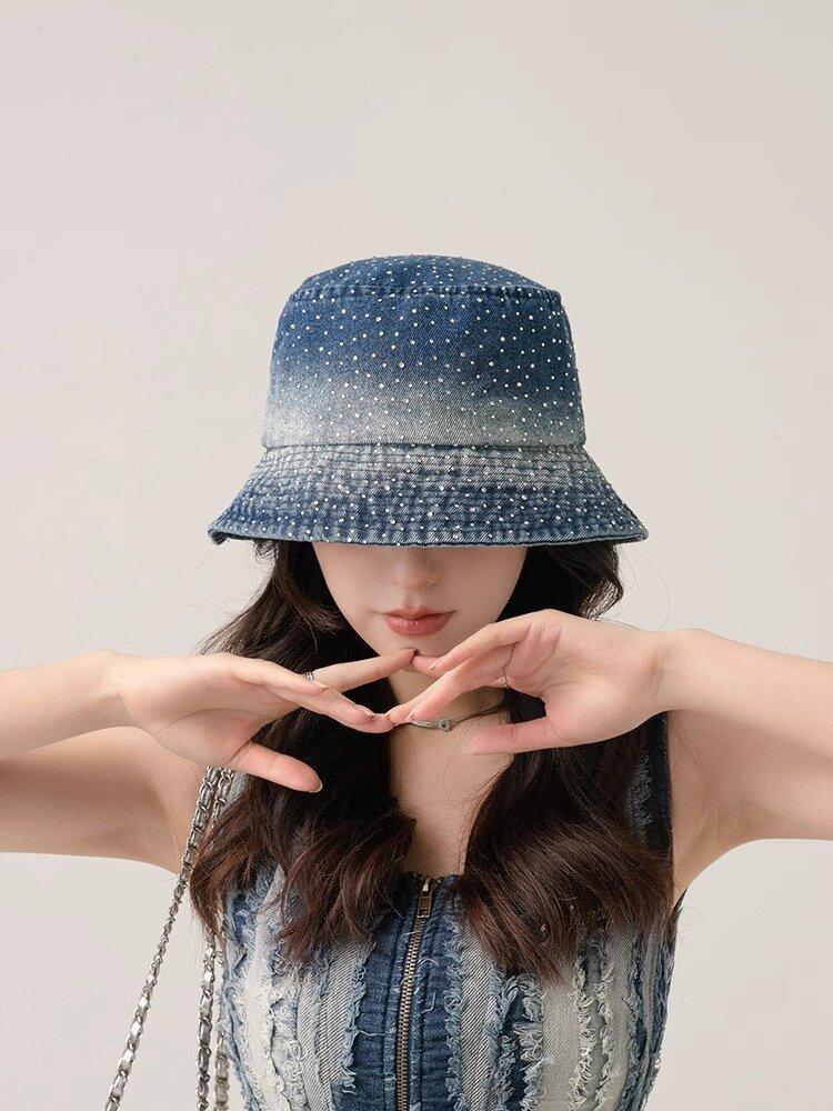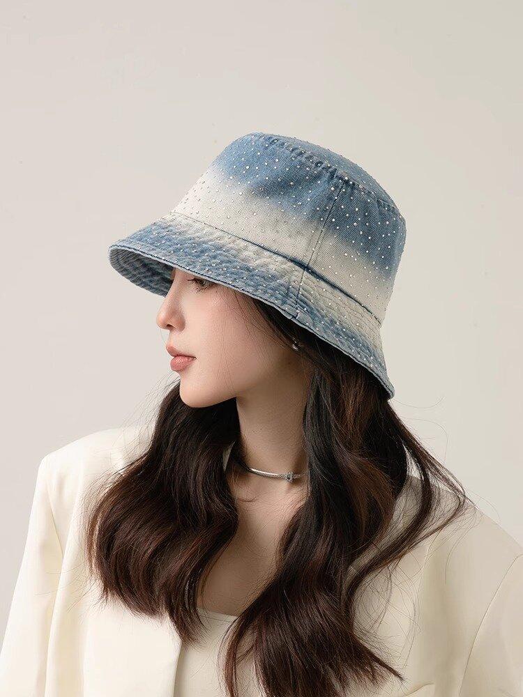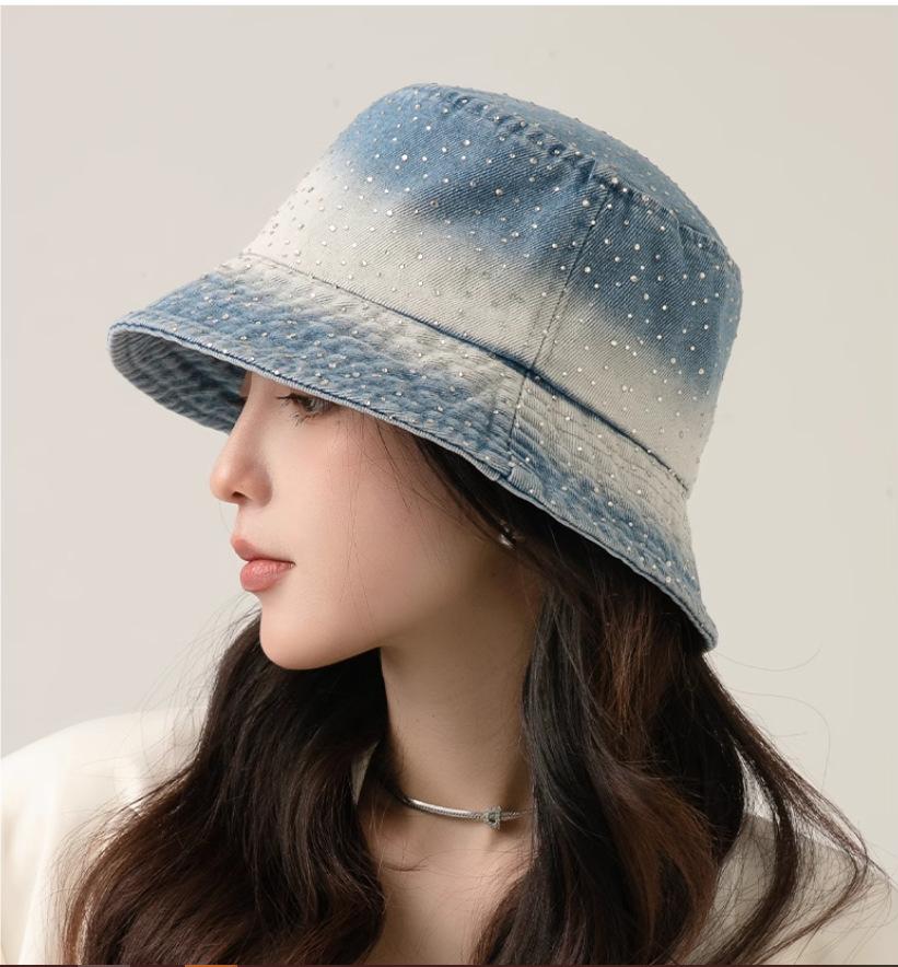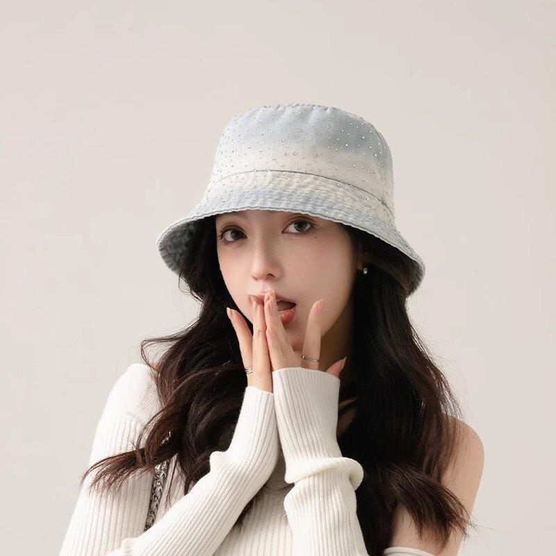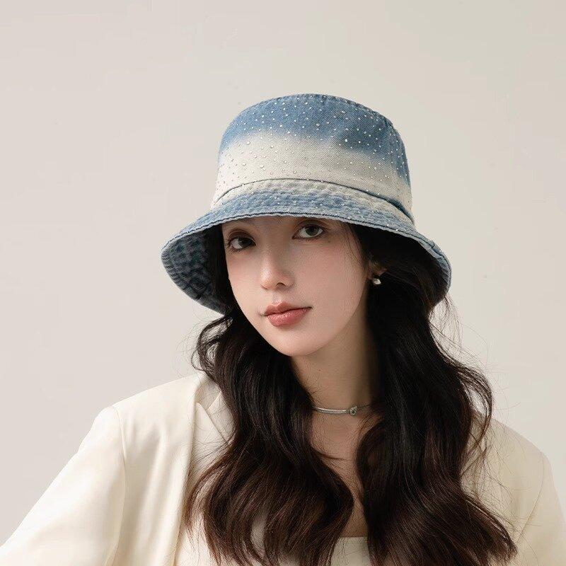 Chapéu de pescador com strass para crianças, primavera e verão, aba grande, protetor solar, boné com gradiente de cores, lavado, jeans, chapéu de bacia para rosto pequeno