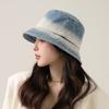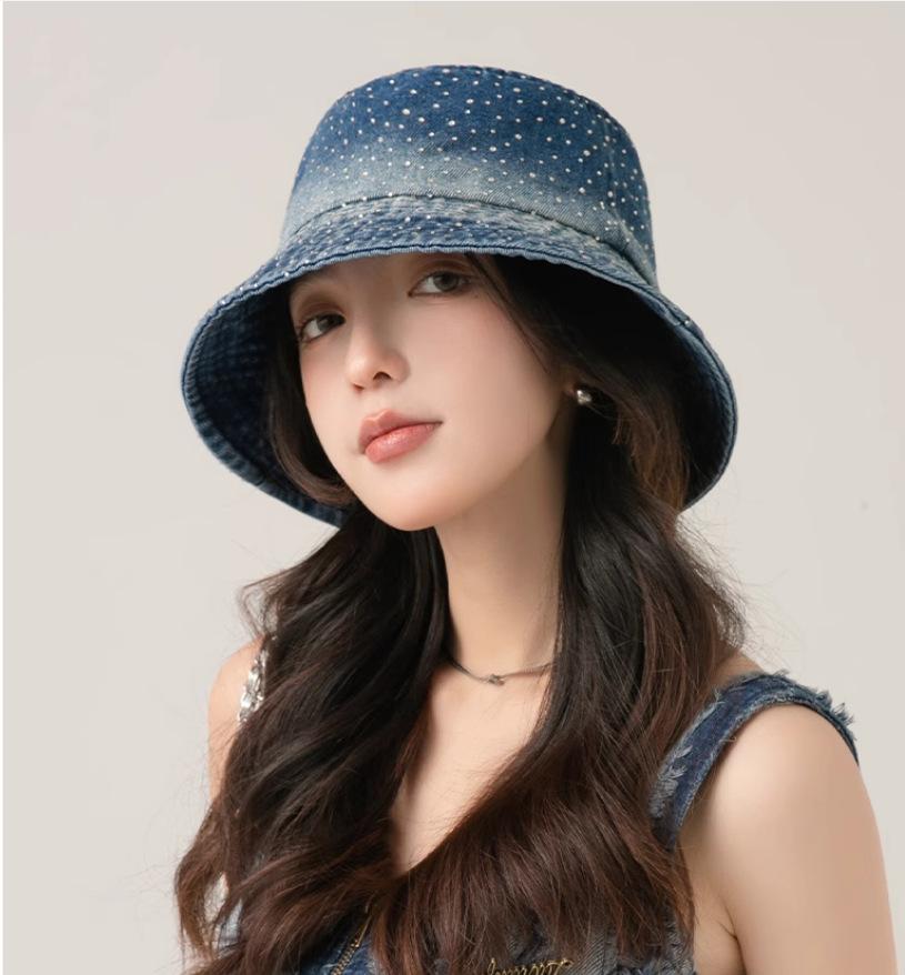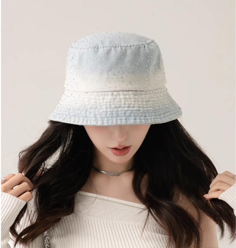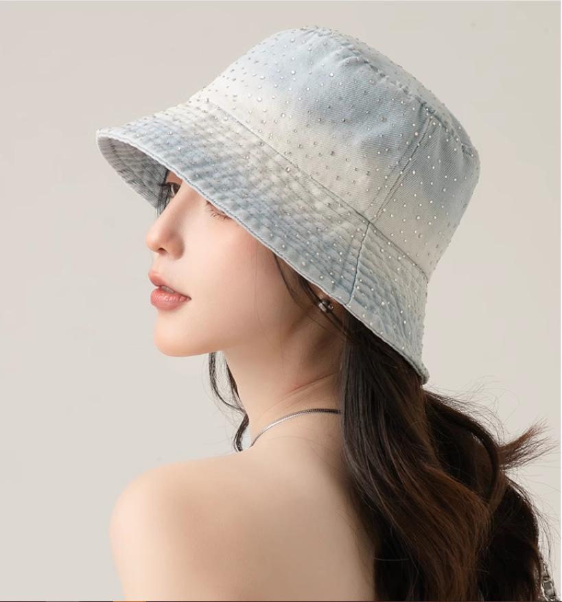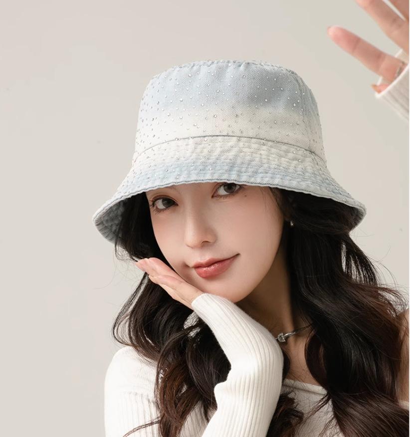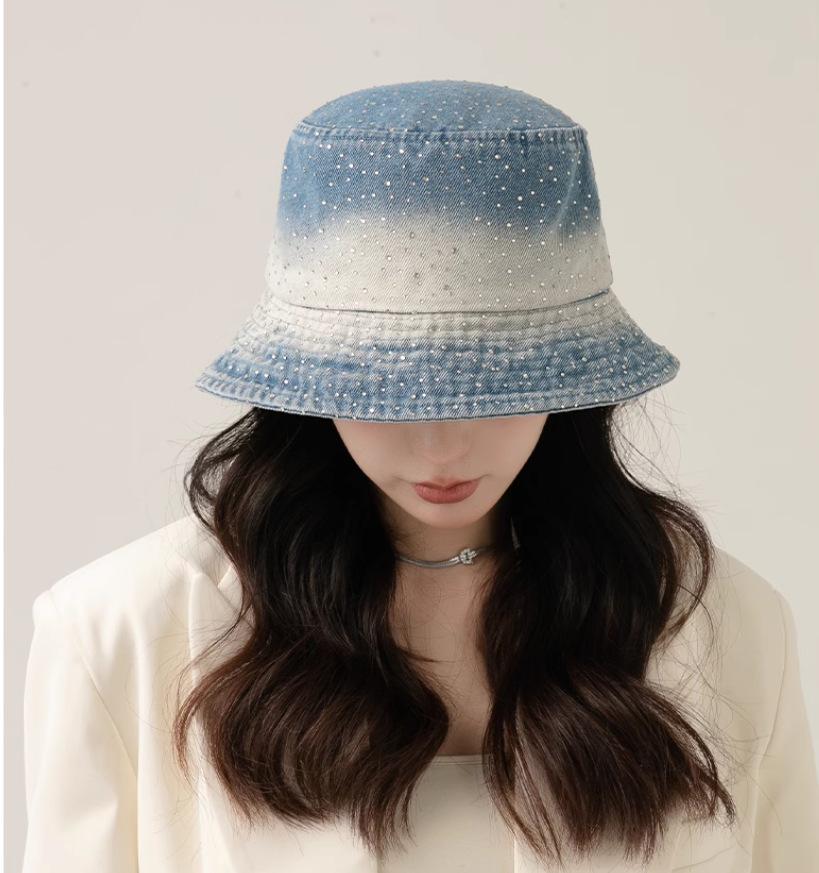 Chapéu de pescador com strass para crianças, primavera e verão, aba grande, protetor solar, boné com gradiente de cores, lavado, jeans, chapéu de bacia para rosto pequeno