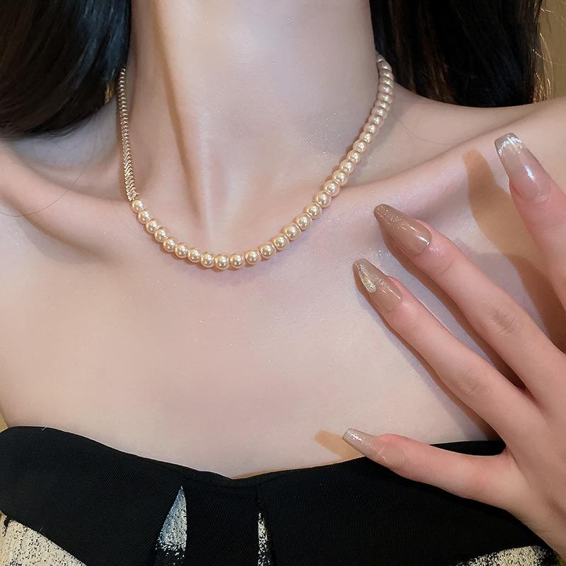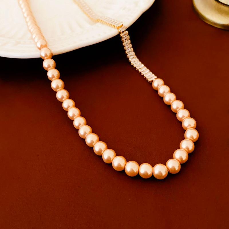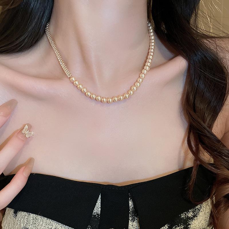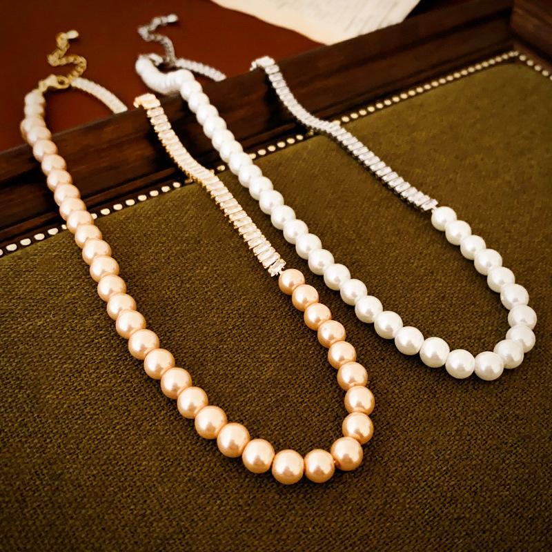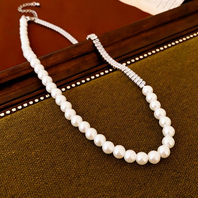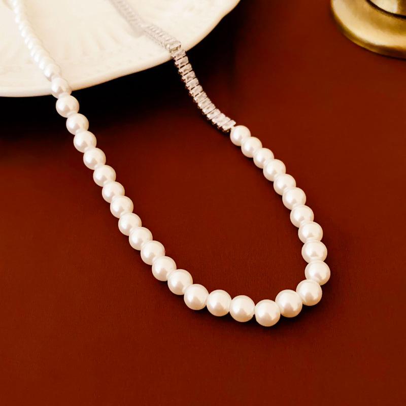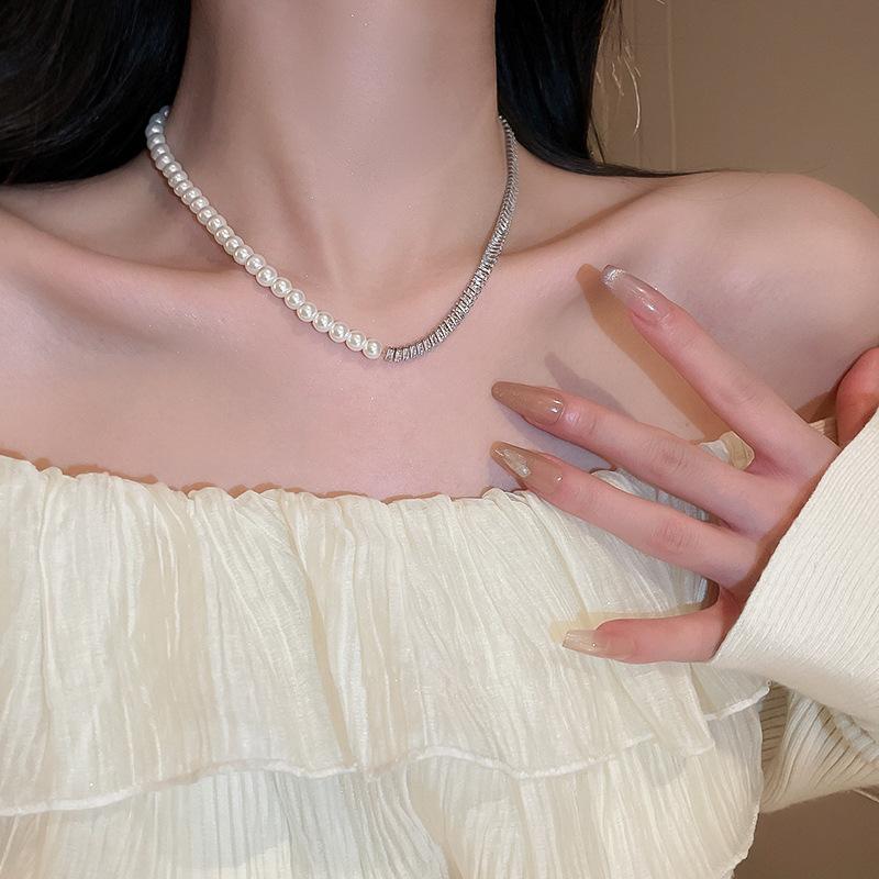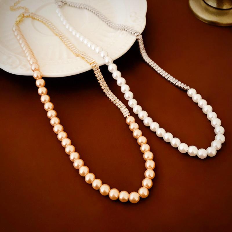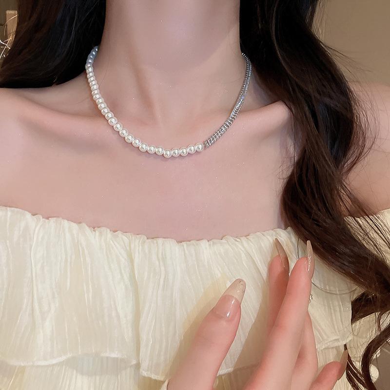Compre Colar suéter com costura de pérolas de zircônia de alta qualidade, ouro verdadeiro, galvanizado, moda elegante, celebridade da internet, colar de clavícula feminino no atacado no Joom.pro