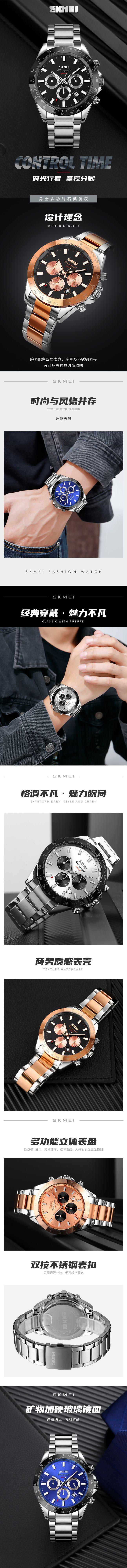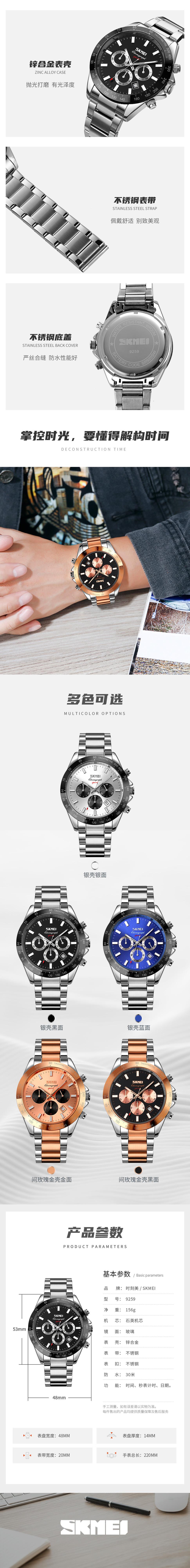 | Material | Caixa de liga de zinco, pulseira de aço inoxidável, espelho de vidro transparente alto, tampa inferior de aço inoxidável, fivela de aço inoxidável |