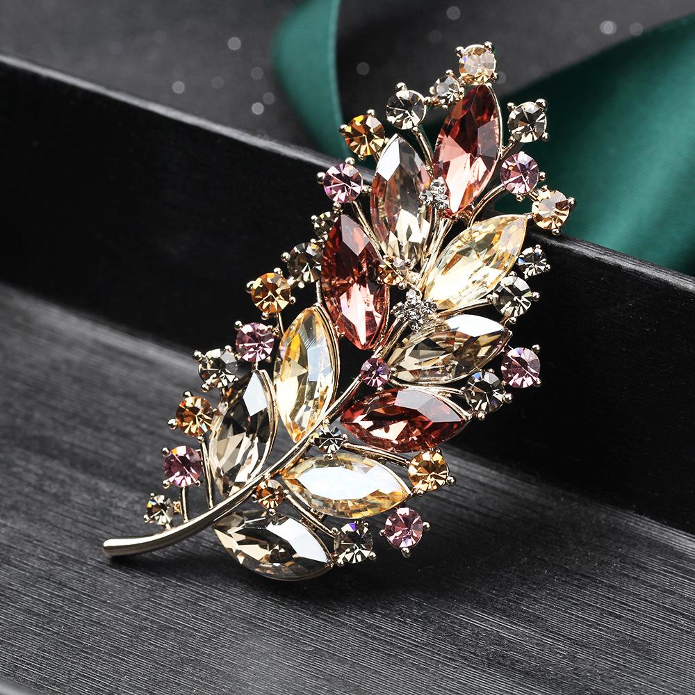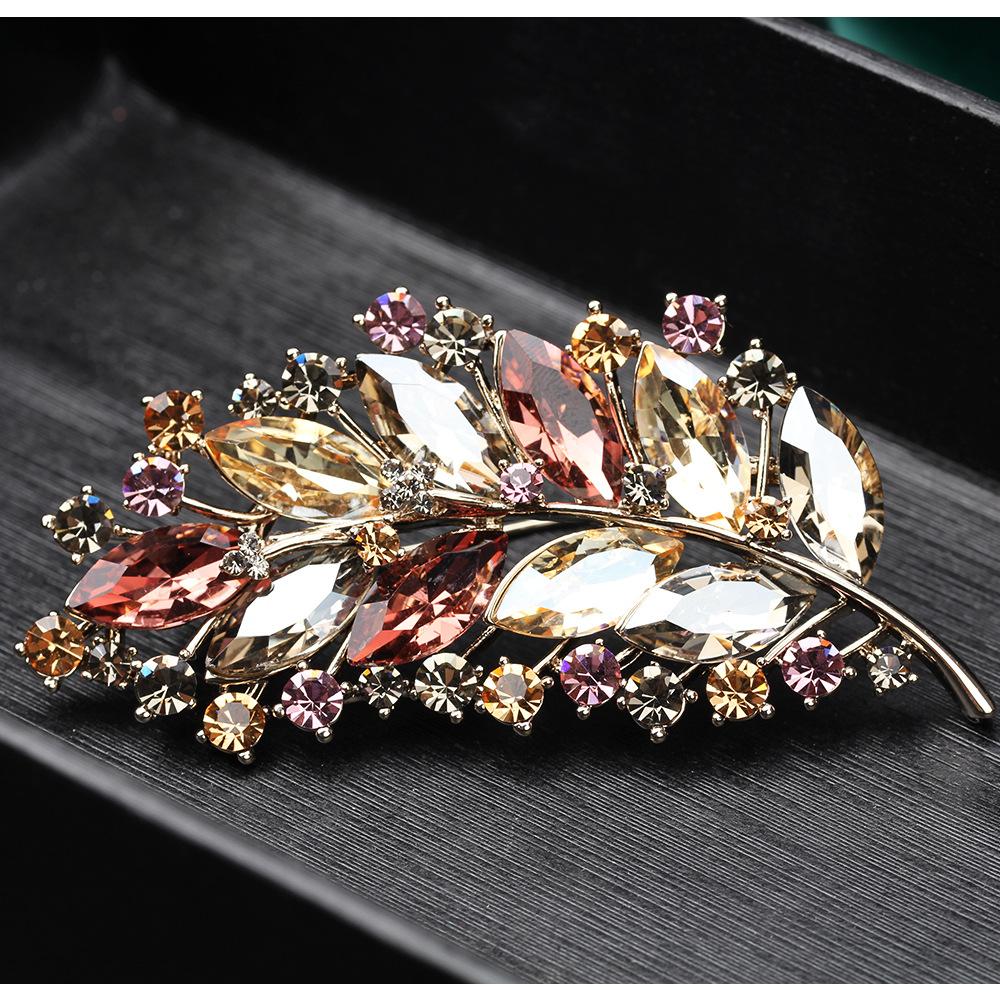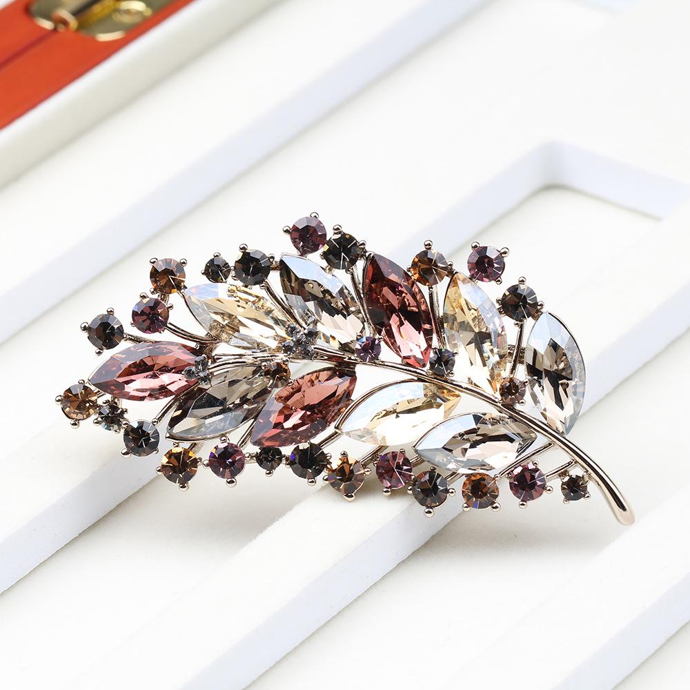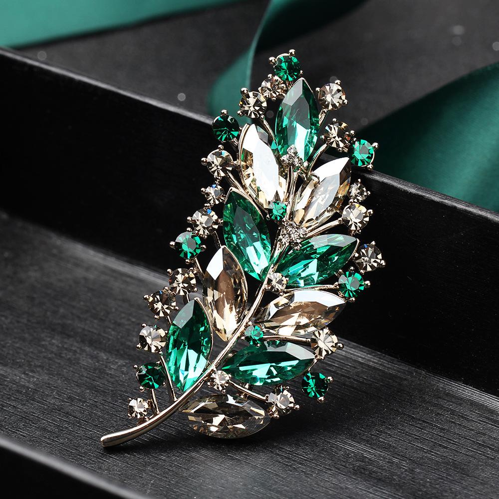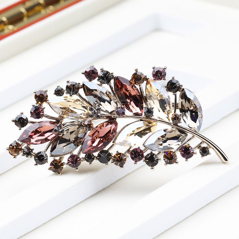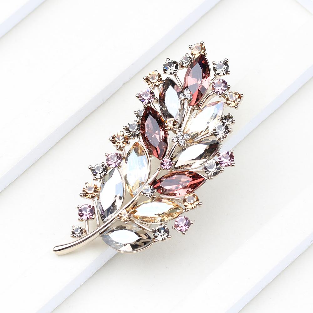 Compre Broche Exagerado de Cristal Artificial de Ouro Galvanizado Vintage de Alta Qualidade Personalizado Multicolorido Folha de Penas Pin Mulheres no atacado no Joom.pro