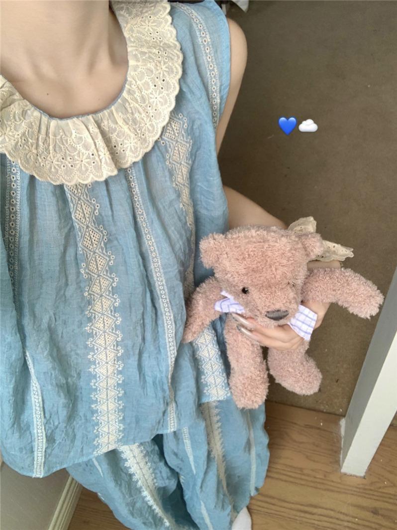 Compre Pijamas Colete de Verão Feminino Calças Sling Estilo Coreano Doce Renda Listrado Roupas Domésticas terno Roupa Externa Fino no atacado no Joom.pro