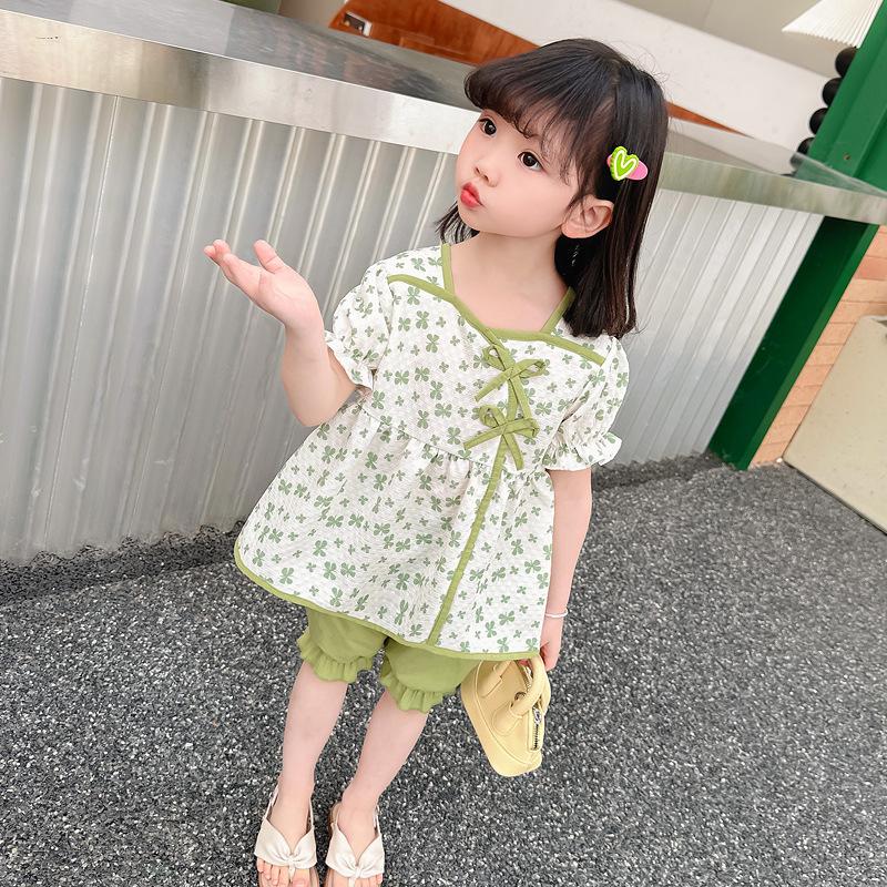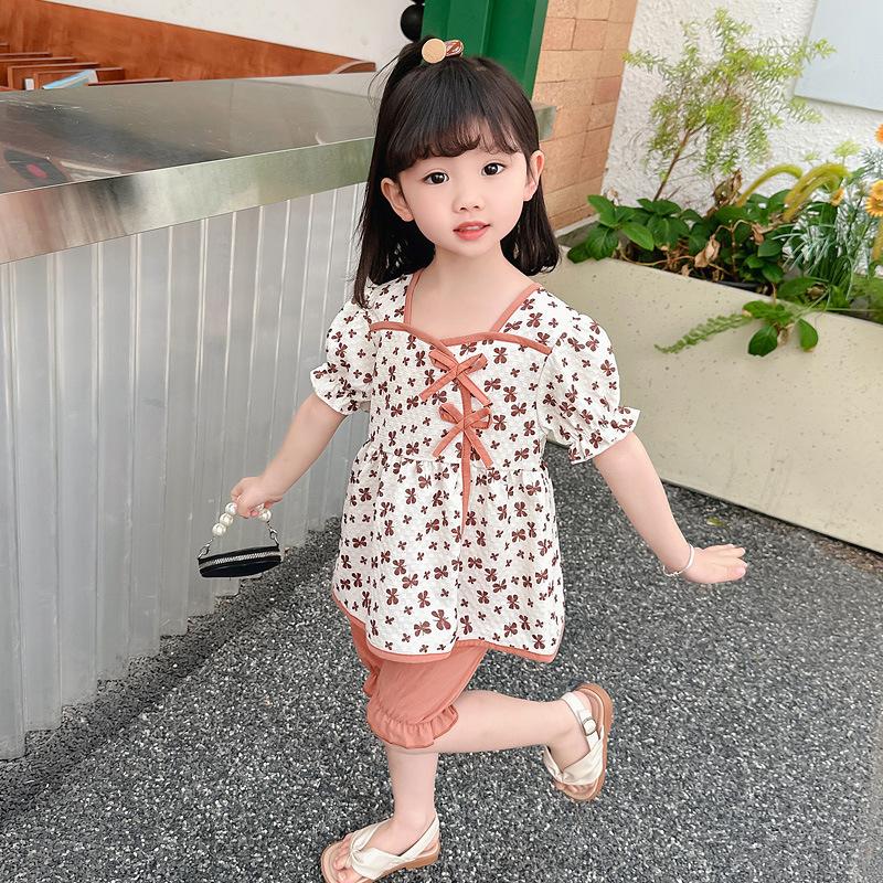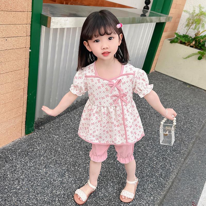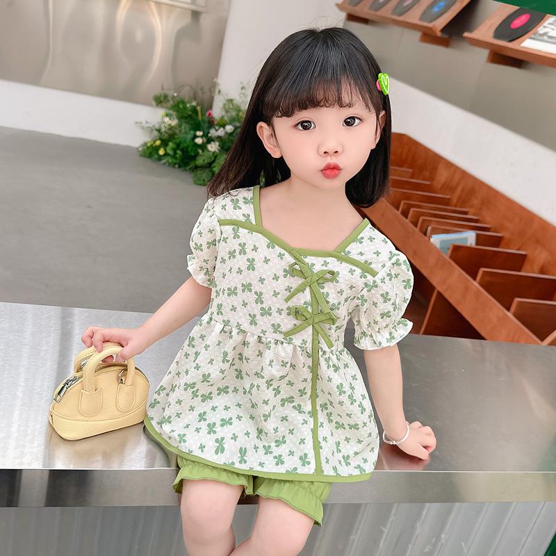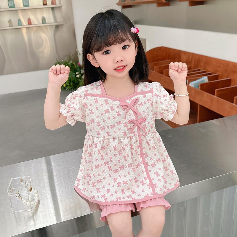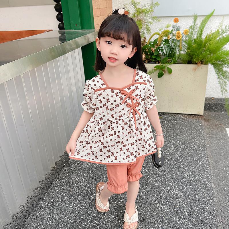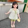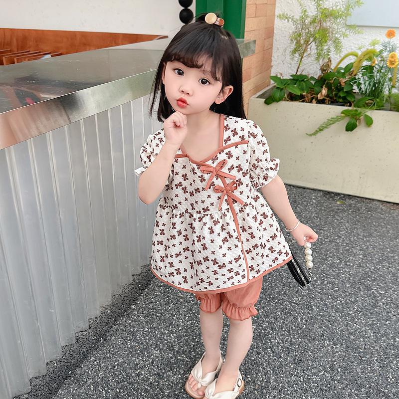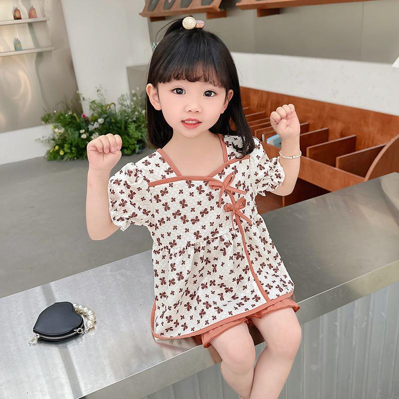 Terno estilo ocidental para meninas verão 2024 novas roupas de verão para bebês meninas verão moda dois laços manga curta