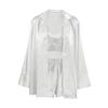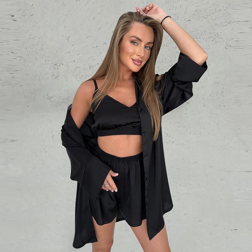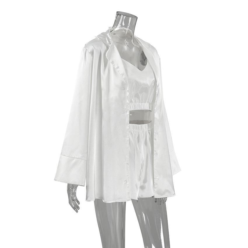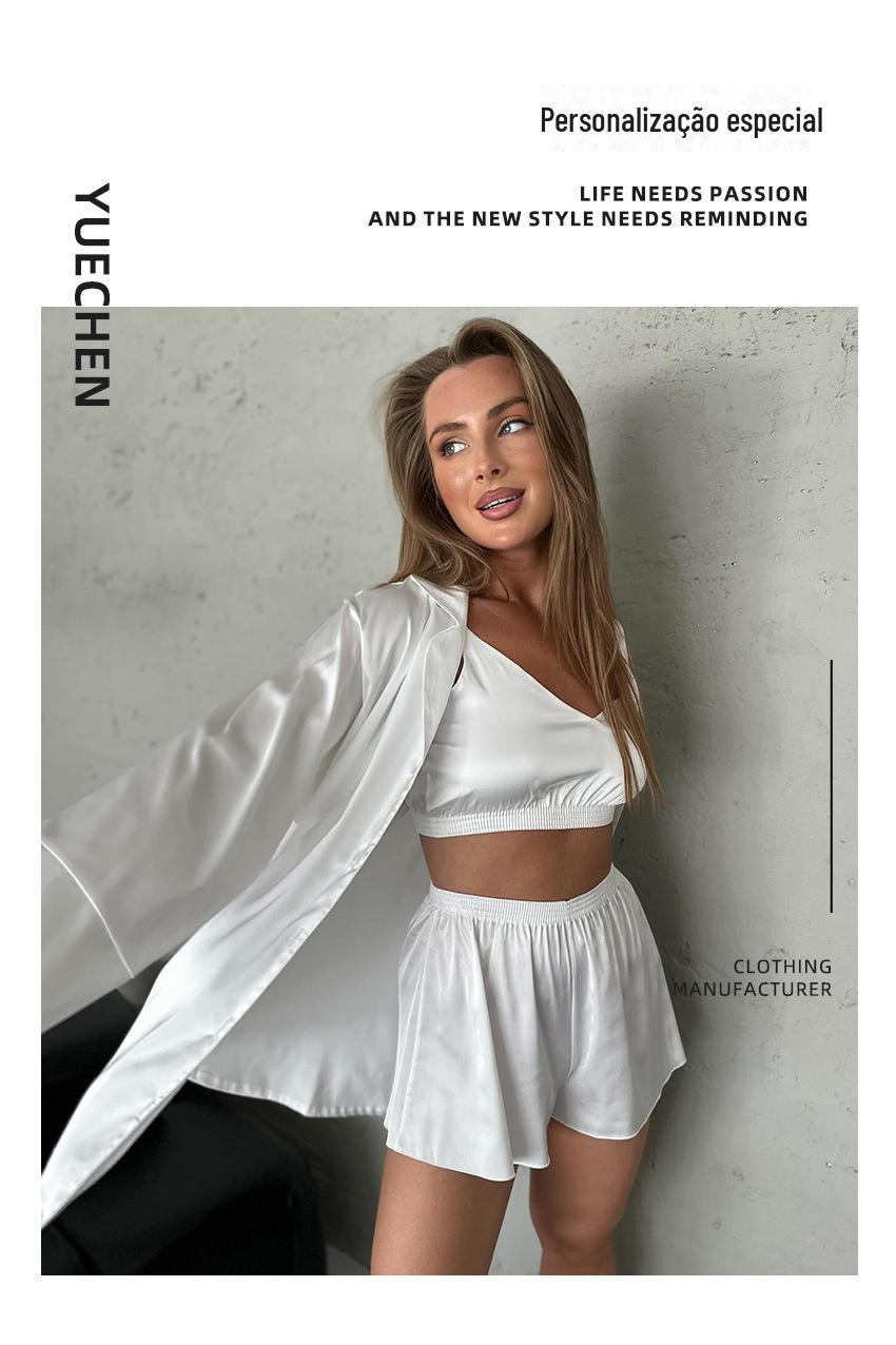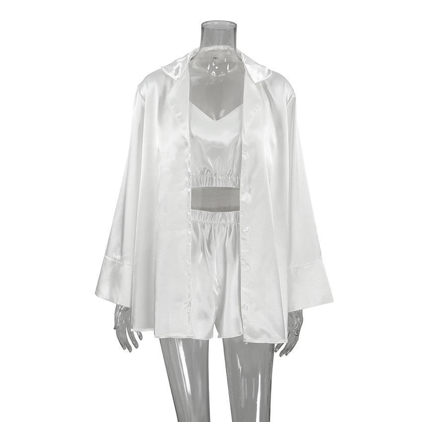 2024 Europeu e Americano Outono Texturizado Branco Solto Confortável Roupa Interior de Manga Comprida Shorts Pijamas Três Peças Transfronteiriças Roupas Domésticas