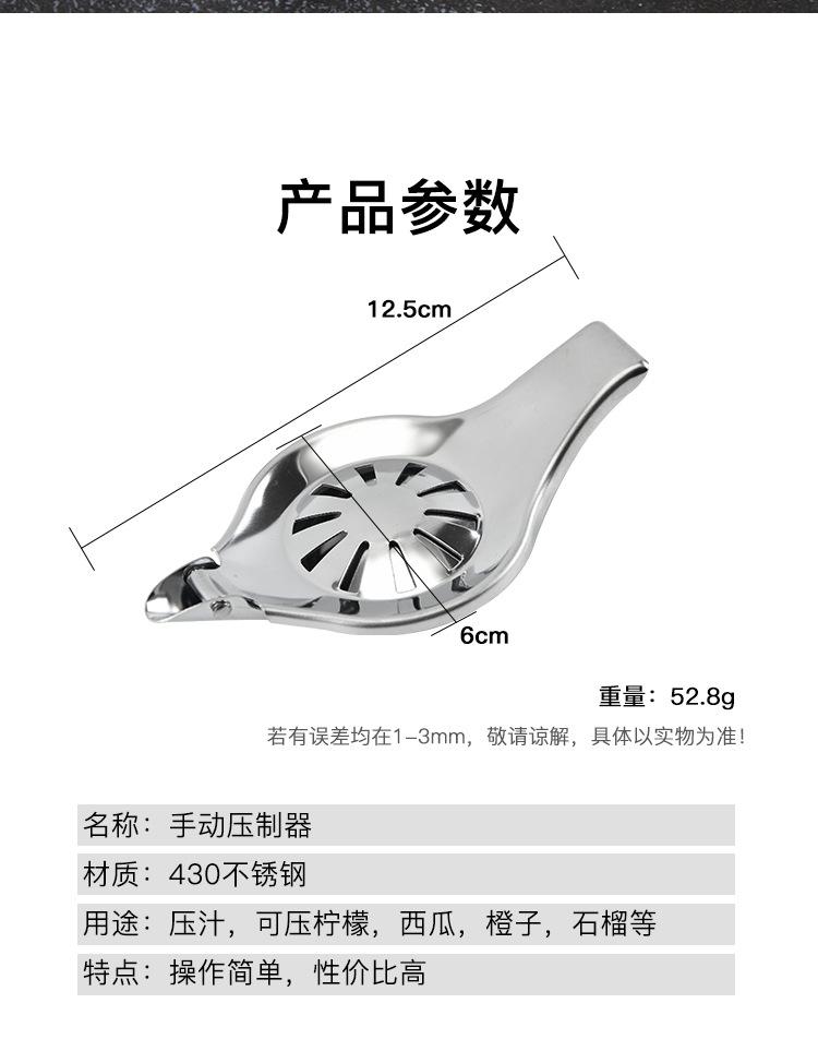 Espremedor manual de limão em aço inoxidável, feito de aço inoxidável 430, placa de espessura 0,8, material espessado, durável, fácil de usar, suporta personalização adicional e atacado em grande escala.