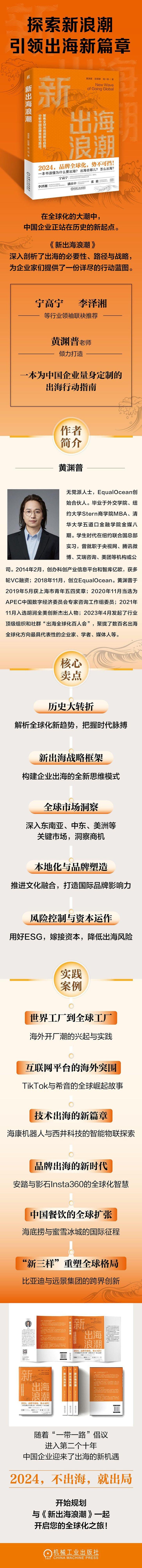 1. Das 52 milhões de empresas privadas na China, 29,5% e 19,9% já implementaram ou estão planejando ir para o exterior. No futuro, mais empresas buscarão aumentar seus mercados no exterior. 2. Este é o primeiro guia com foco na expansão internacional de empresas privadas. Ele fornece novas direções de expansão no exterior, metodologias e casos práticos sobre como fazer, como fazer e para onde ir para o exterior. 3. O autor Huang Yuanpu e seu EqualOcean são marcas de mídia influentes na nova direção de expansão no exterior. Eles têm filiais em todo o mundo e têm informações em primeira mão sobre empresas chinesas indo para o exterior. 4. Este livro é recomendado em conjunto por especialistas do setor, como Ning Gaoning, o famoso timoneiro de uma empresa central, e Li Zexiang, o "Padrinho da DJI" e "Mentor de Ciência e Tecnologia".